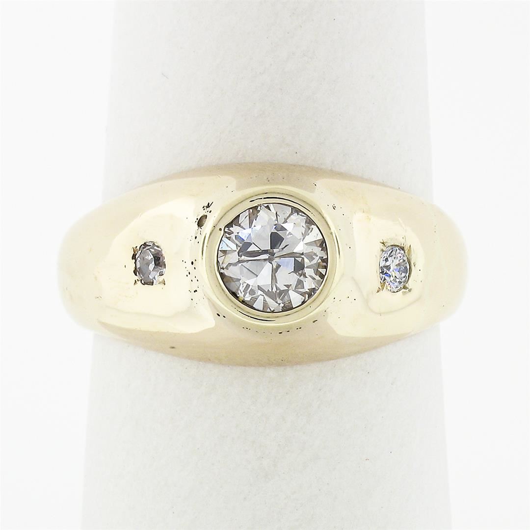 A vintage solid 14k yellow gold domed men's band ring, featuring 1 round brilliant cut natural diamond (J/K - SI2 ; 0.56ct), and 2 old single & round brilliant cut natural diamonds (G/H - VS2 ; 0.06ctw). The ring is size 6.5, weighs a total of 4.93 grams, and measures 9.9mm wide.