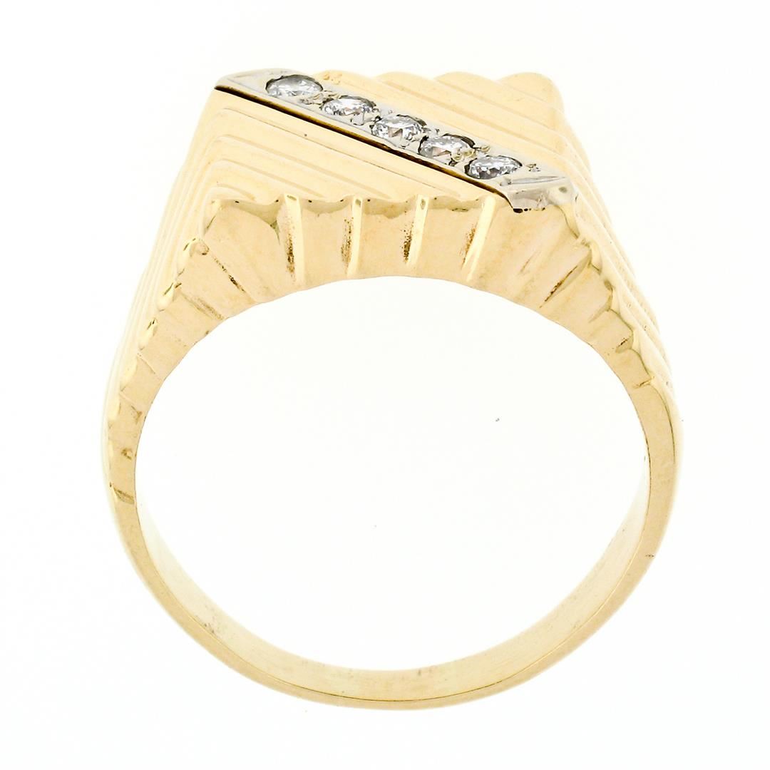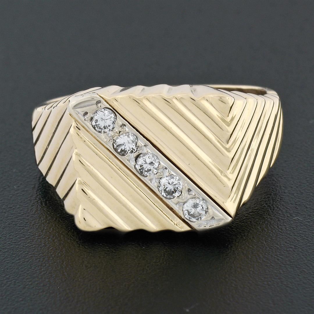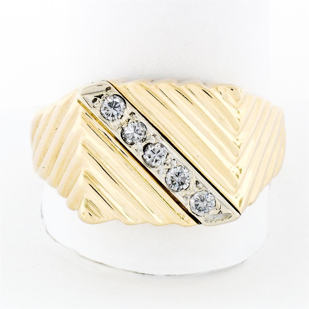 A vintage solid 14k yellow gold grooved mens ring, with 5 round brilliant cut natural diamonds (F/G - VS2; 0.20ctw). The ring is size 11, weighs a total of 9.7 grams, and measures 13.0mm wide.