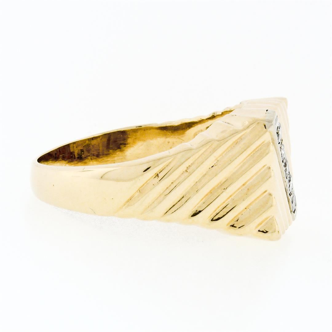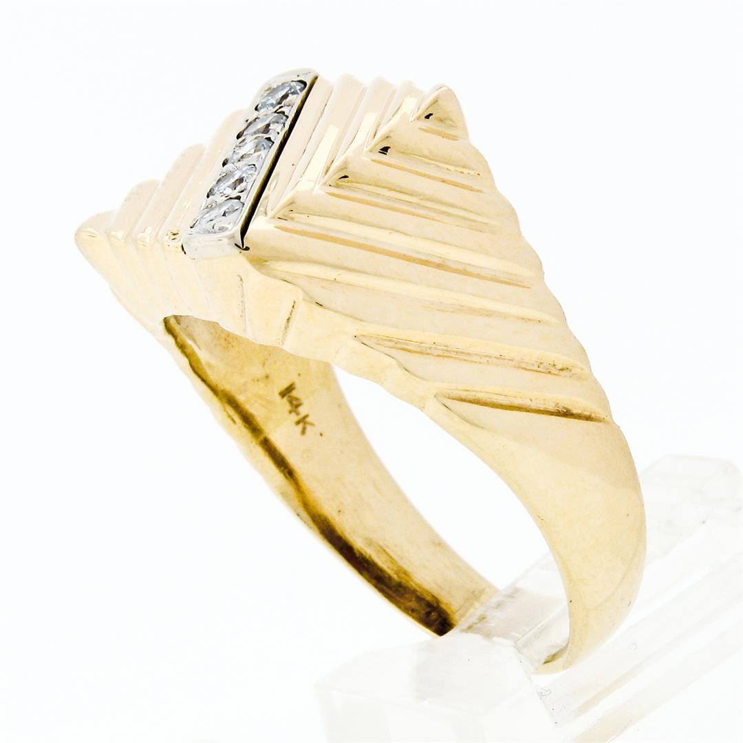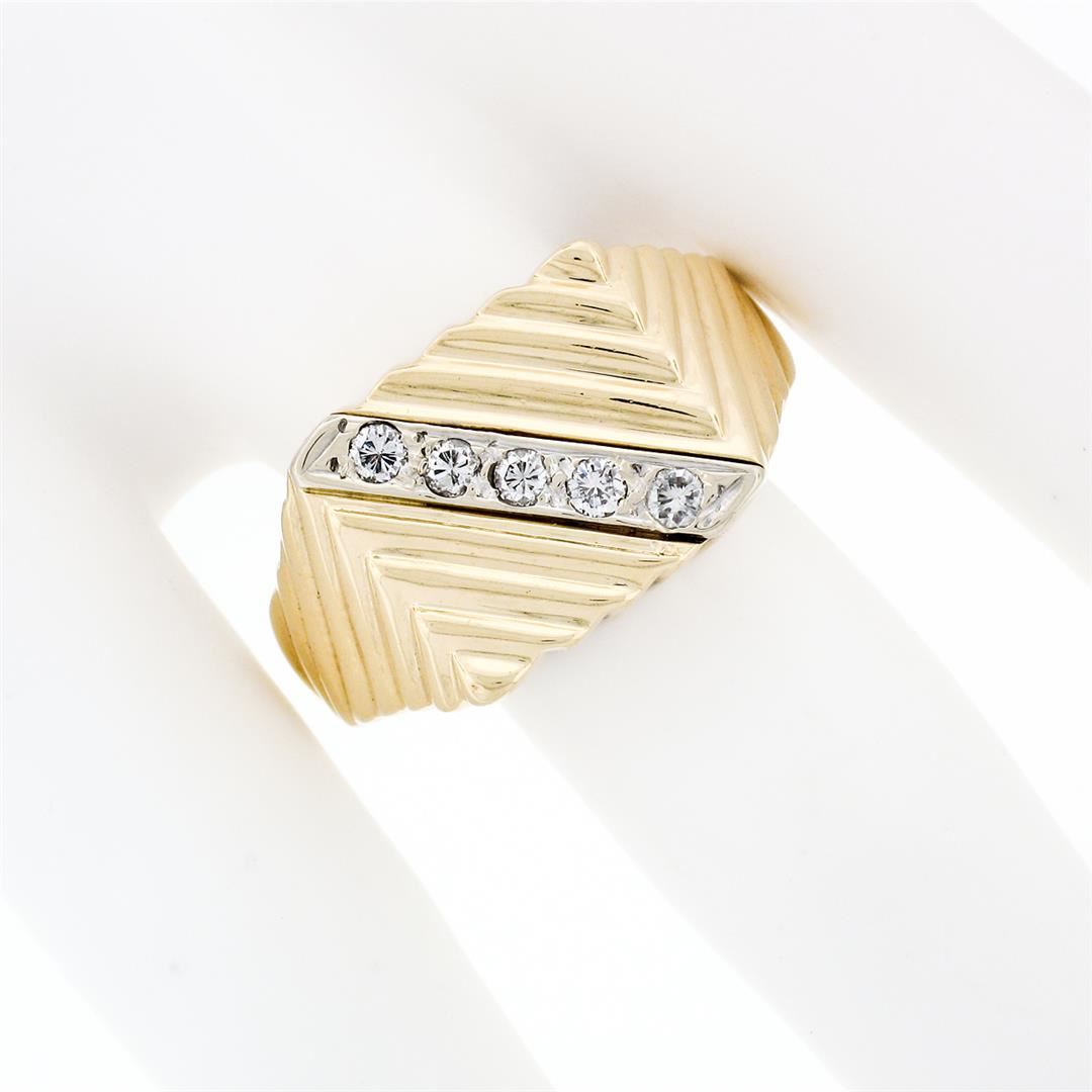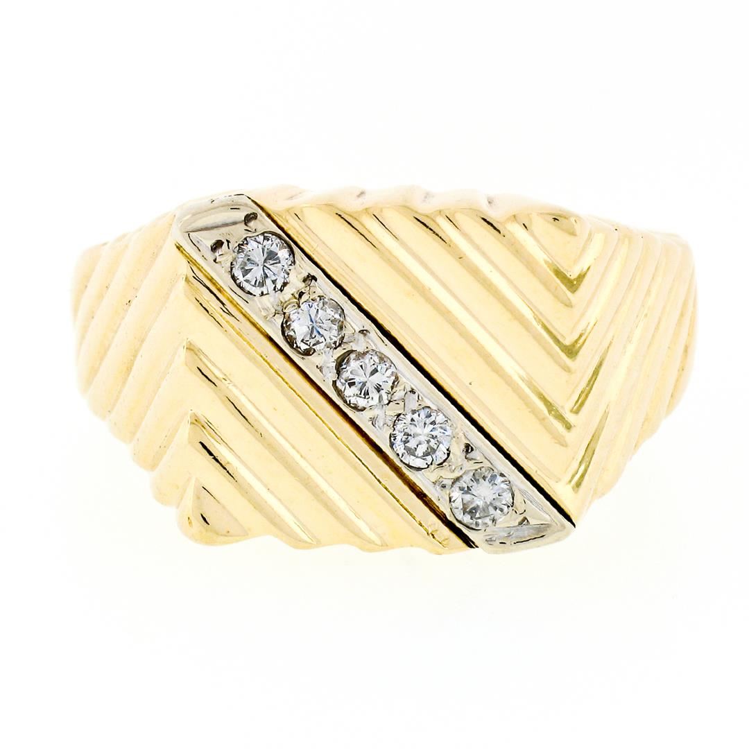 A vintage solid 14k yellow gold grooved mens ring, with 5 round brilliant cut natural diamonds (F/G - VS2; 0.20ctw). The ring is size 11, weighs a total of 9.7 grams, and measures 13.0mm wide.