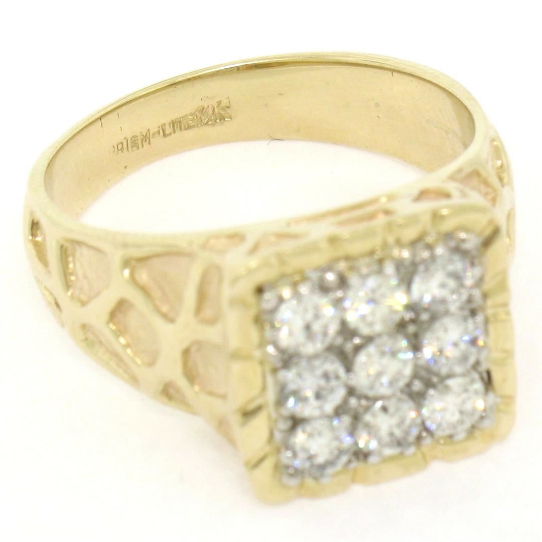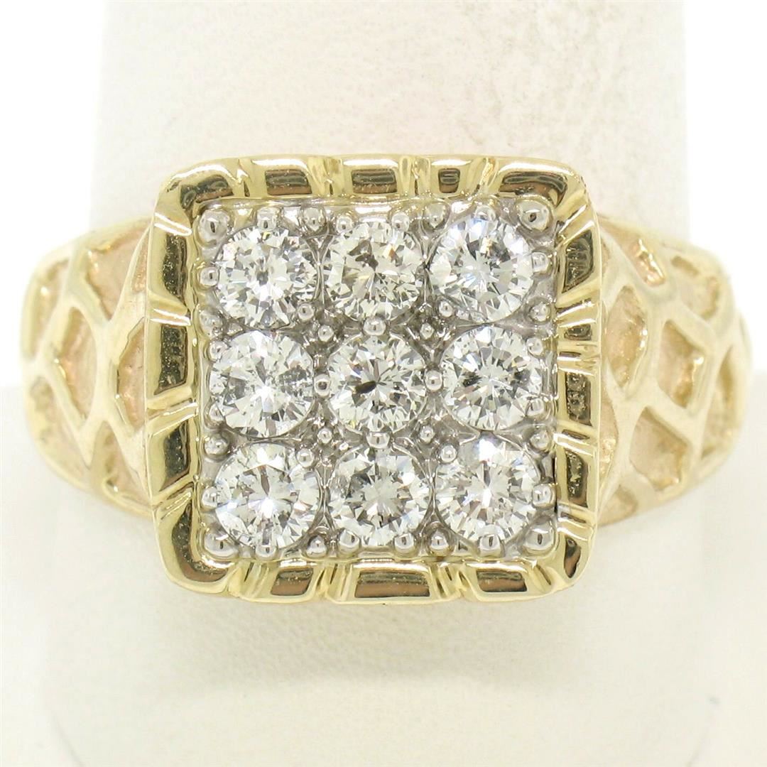 One Men's 14K Two Tone Gold Nugget Design .90ctw Round BRILLIANT Diamond Cluster Ring. Item Details: Material: 14K Solid Yellow Gold, Weight: 8.59 Grams, Stone(s): (9) Natural Genuine Diamonds - Round Brilliant Cut - Prong Set - F/G Color - VS2 Clarity, Total Carat Weight: 0.90 (approx.), Ring Size: 9.5 , Ring Width: 13.20mm, Ring Height: 5.9mm rise off the finger, Condition: Like New!
