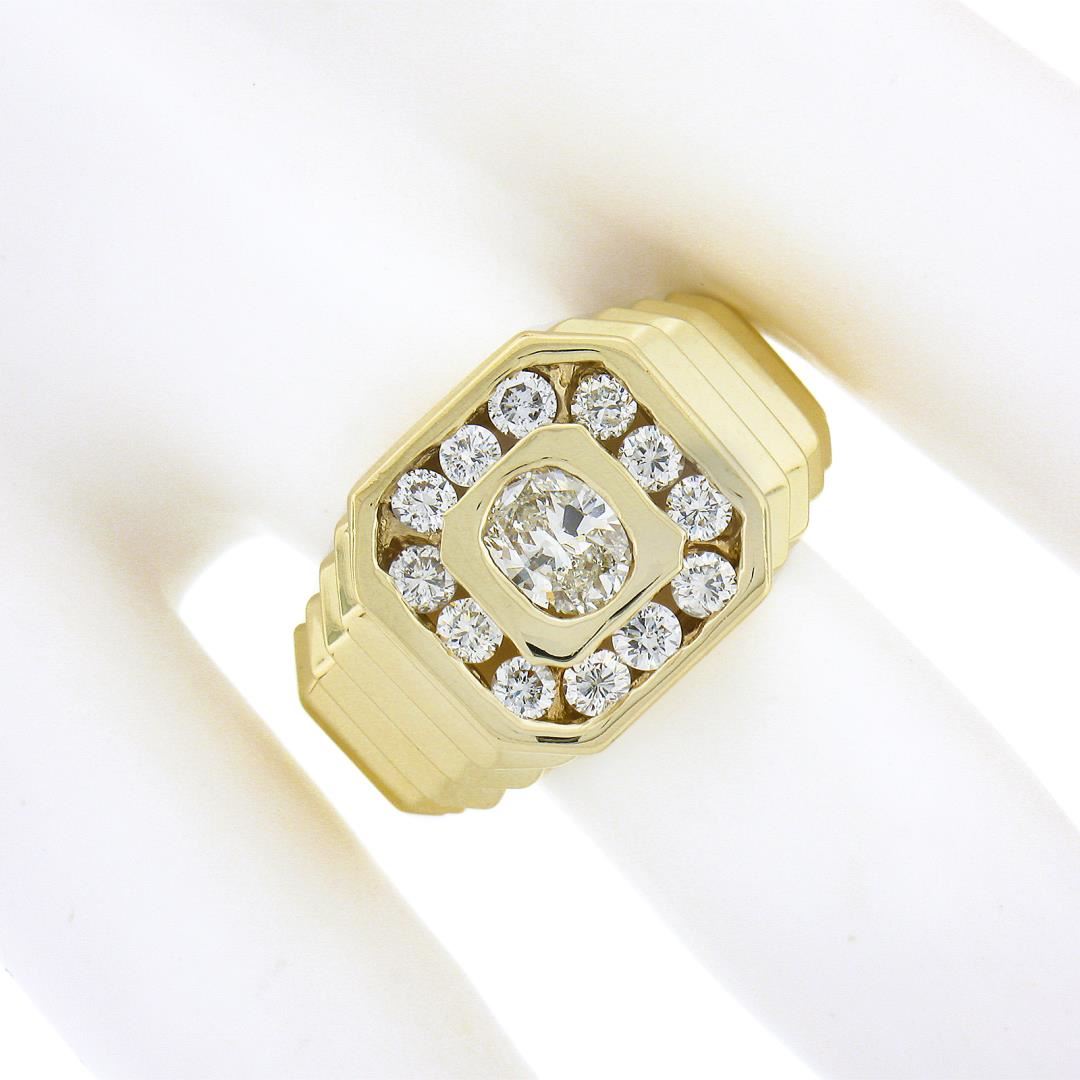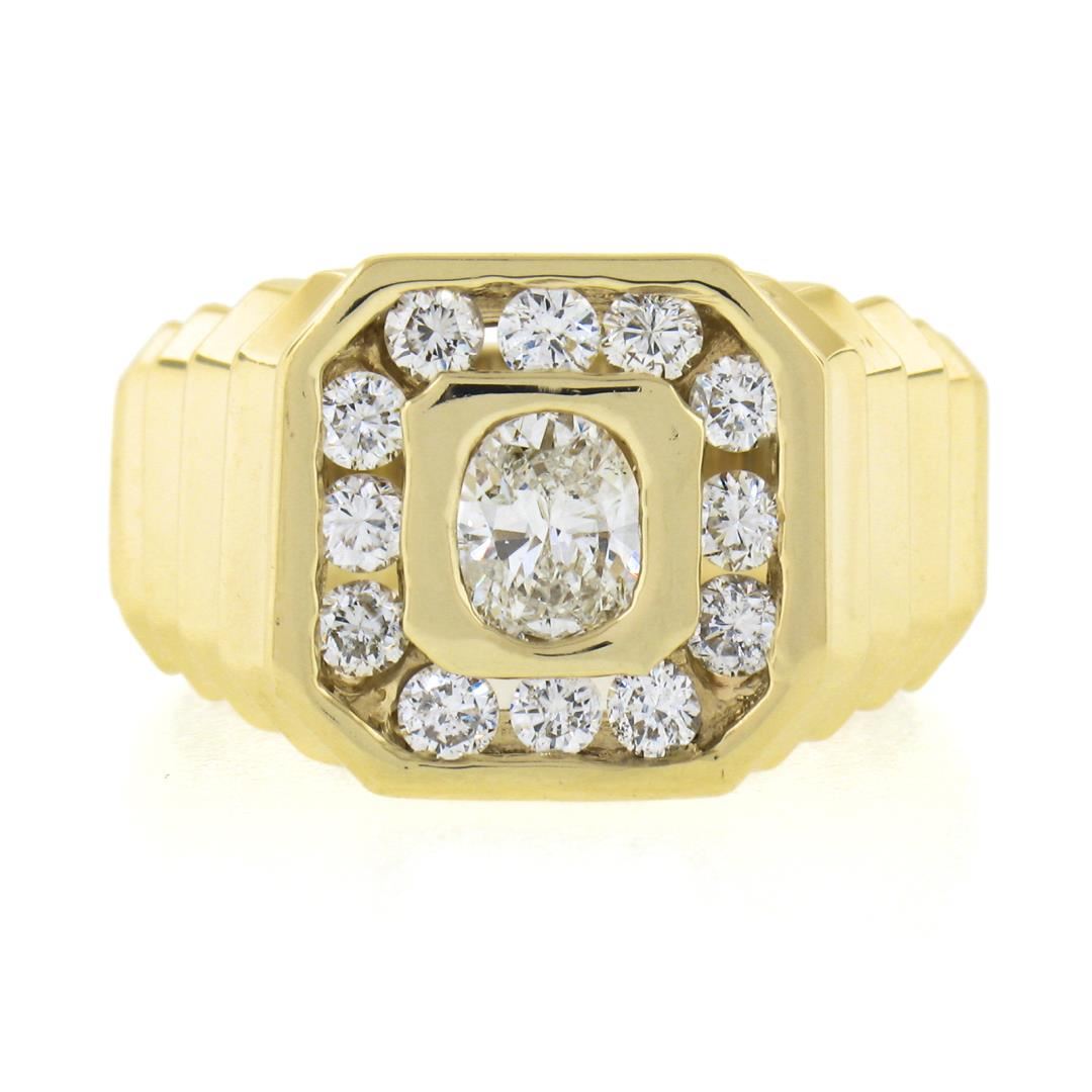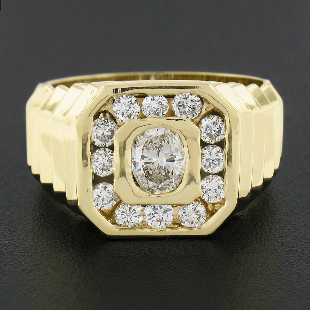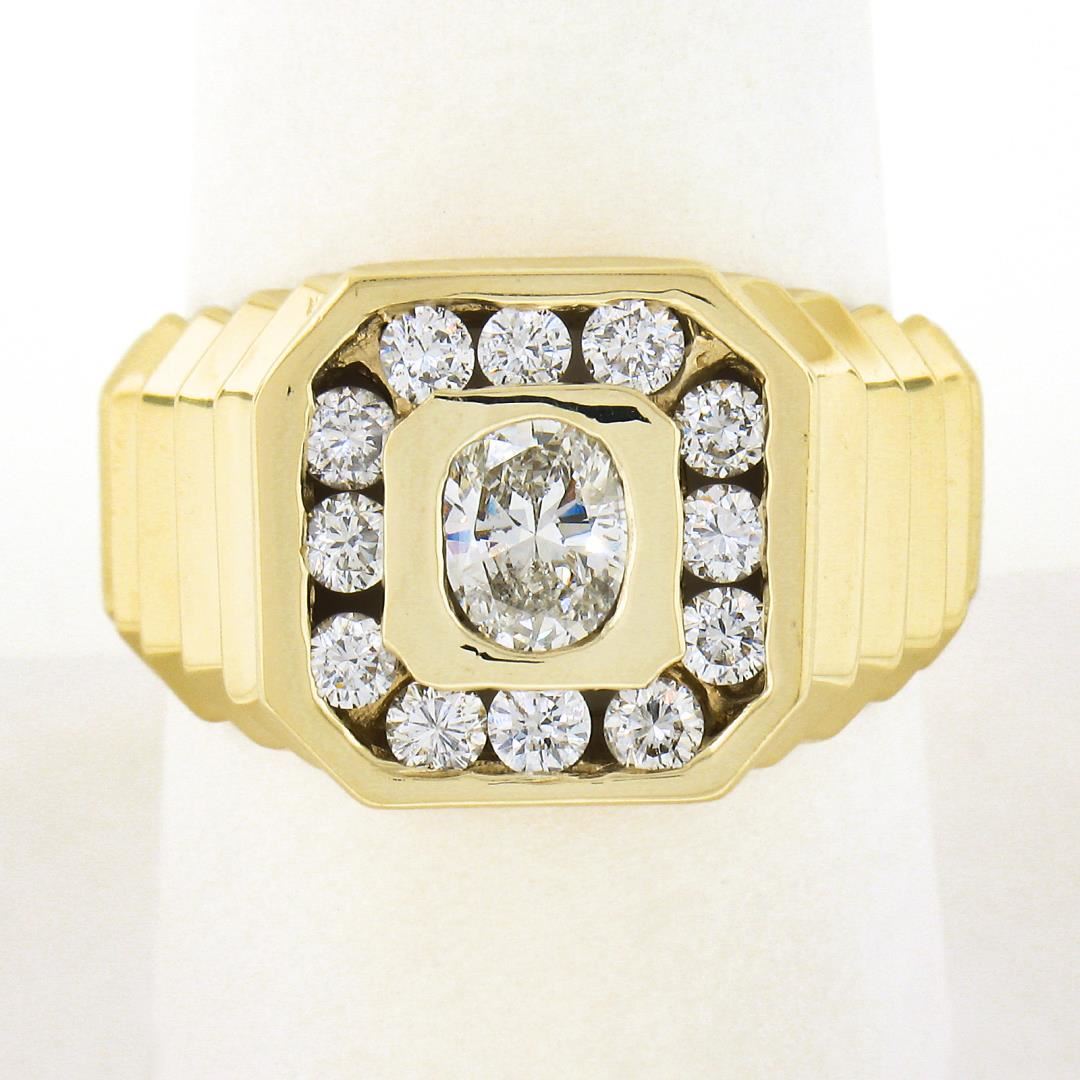 A solid 14k yellow gold mens ring, with 1 oval brilliant cut natrual diamond (J - I1 ; 5.73x4.73mm - 0.53ct), and 12 round brilliant cut natural diamonds (G/H - SI1/SI2 ; 0.60ctw). The ring is size 9.5, weighs a total of 9.03 grams, and measures 13.4mm wide.