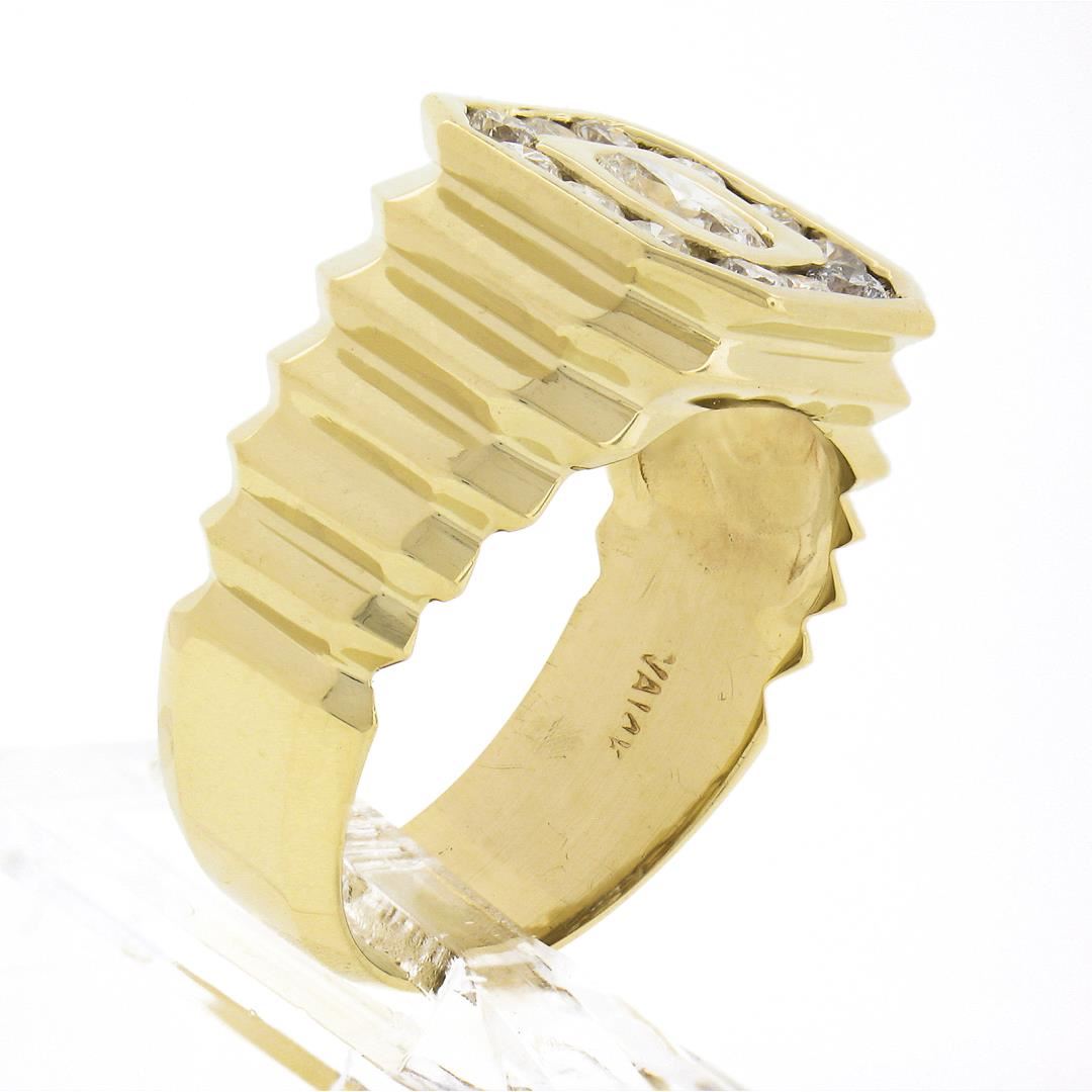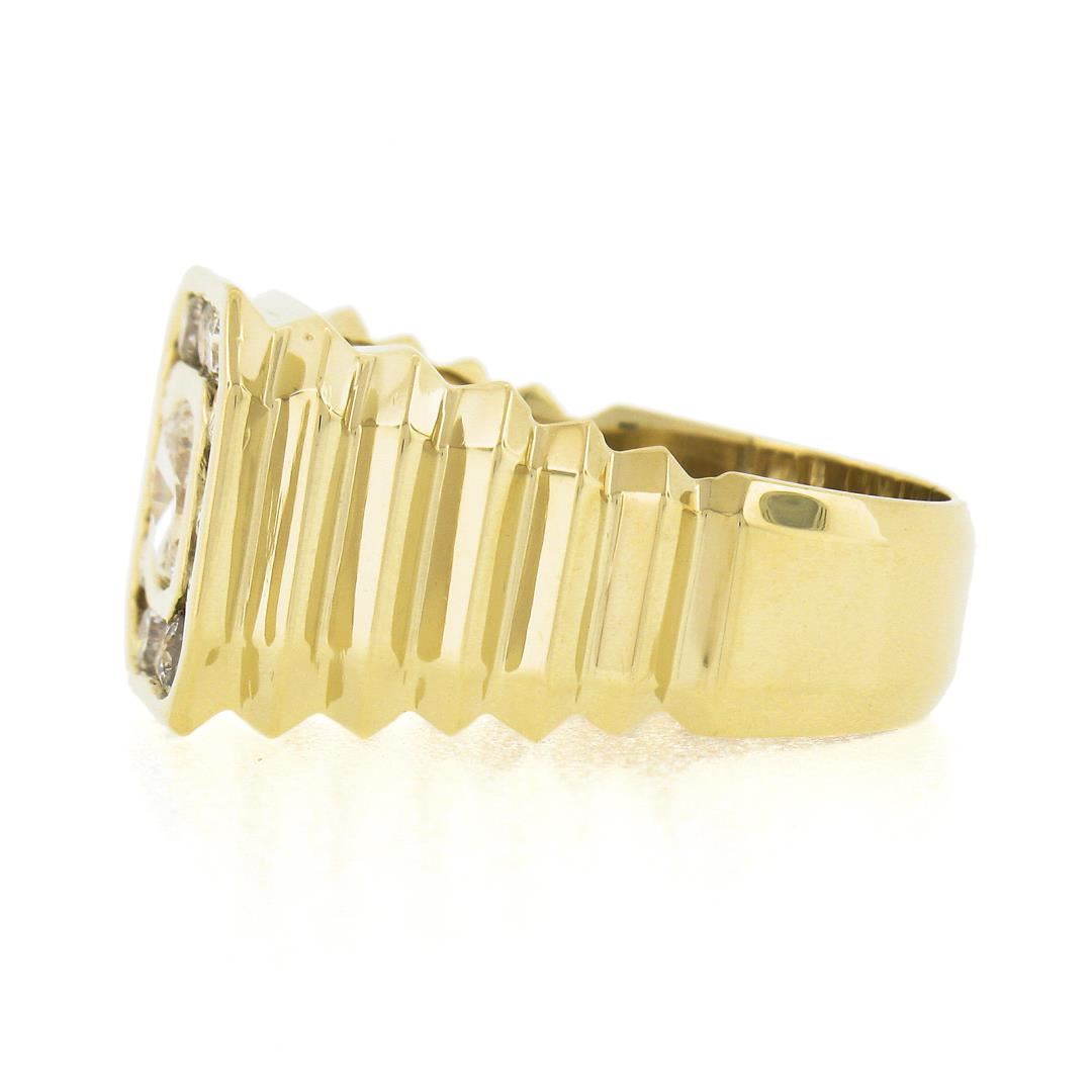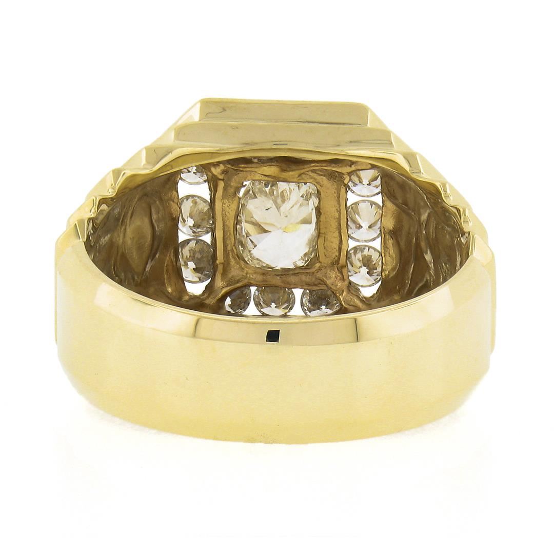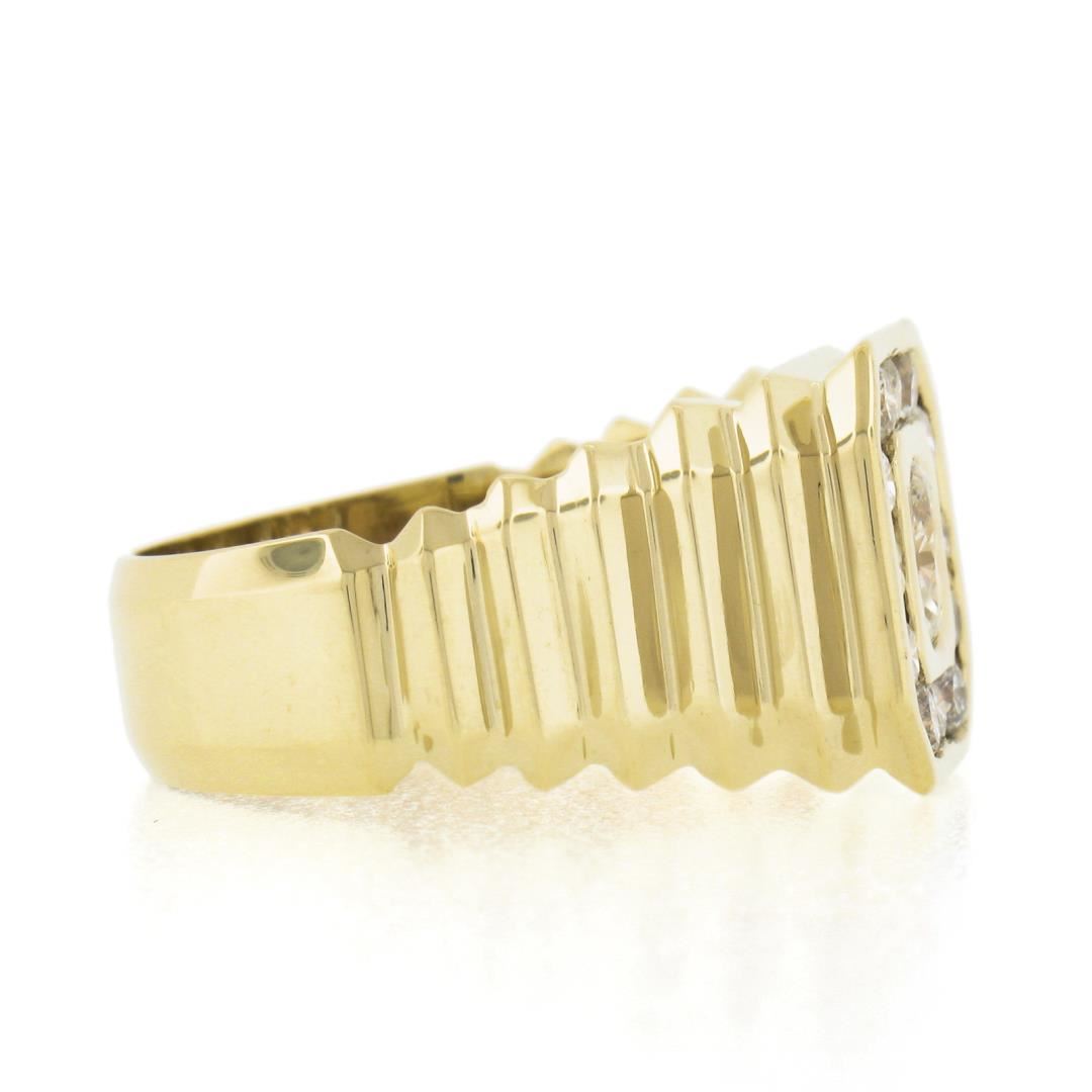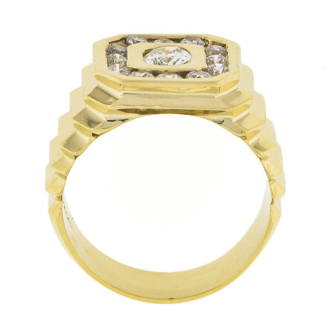 A solid 14k yellow gold mens ring, with 1 oval brilliant cut natrual diamond (J - I1 ; 5.73x4.73mm - 0.53ct), and 12 round brilliant cut natural diamonds (G/H - SI1/SI2 ; 0.60ctw). The ring is size 9.5, weighs a total of 9.03 grams, and measures 13.4mm wide.