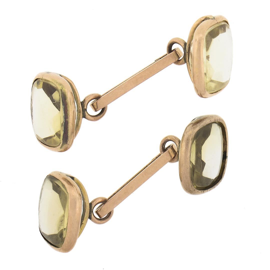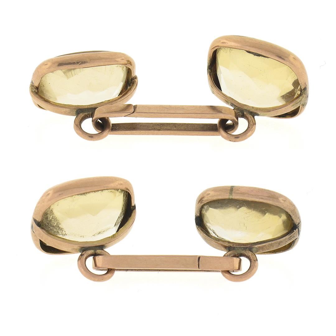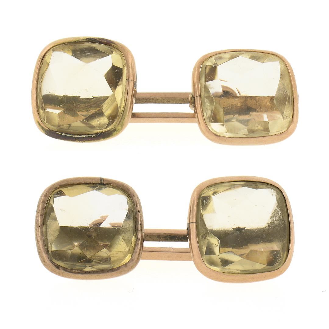 An antique solid 10k yellow gold cufflinks, with 4 cushion cut natural lemon quartz (10.8x10.8mm each ). These cuff links have a chain link design with a clearance of 23mm, weigh a total of 8.14 grams, and the front panels measure 12.8x12.8mm.