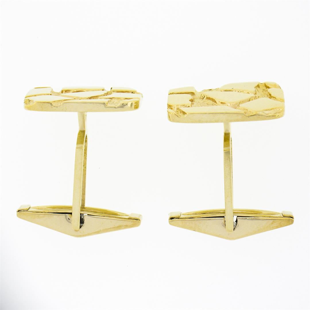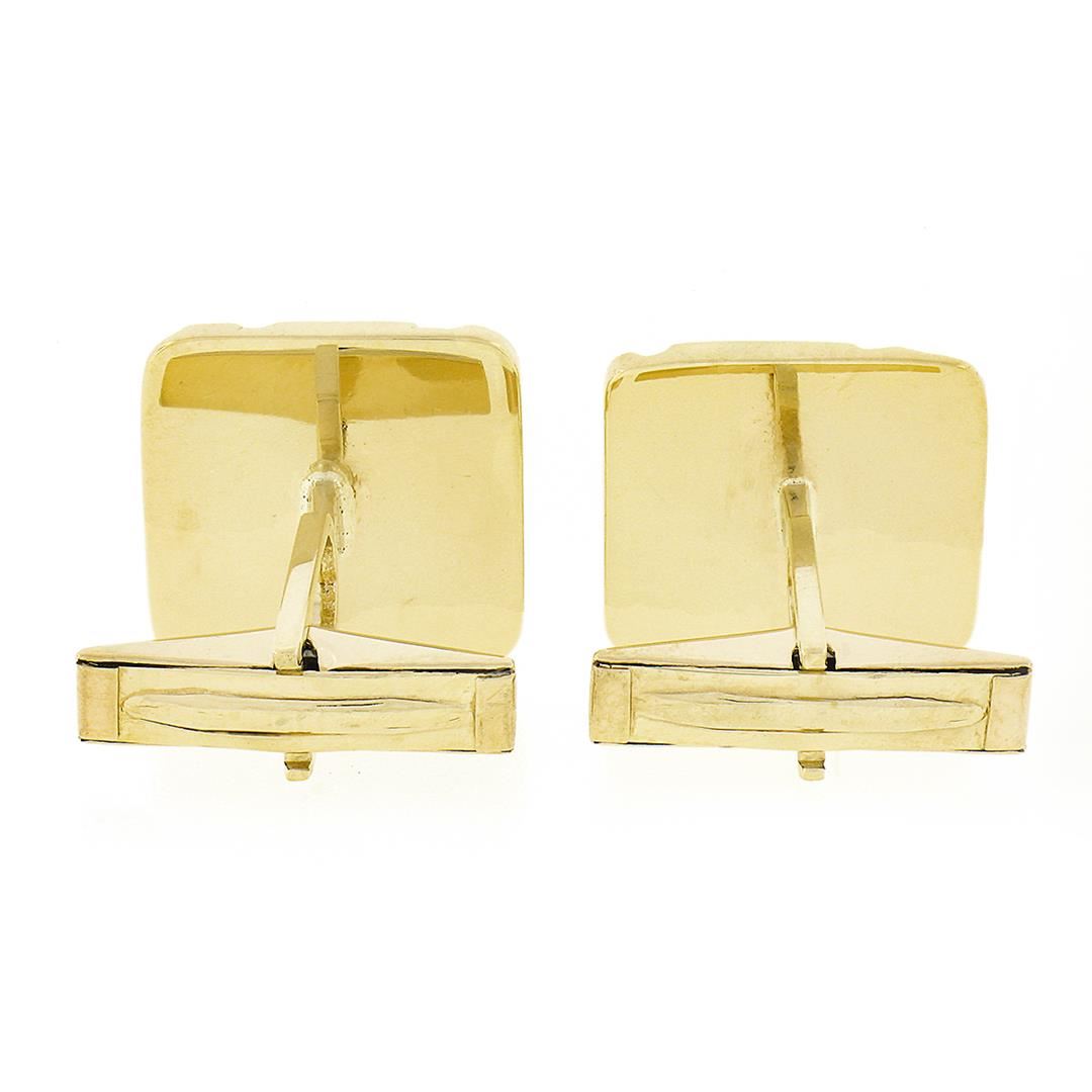 A solid 14k yellow gold cufflinks. These cuff links have a swivel design with a clearance of 15.35mm, weigh a total of 12.42. grams, and the front panels measure 16.35x16.45mm.