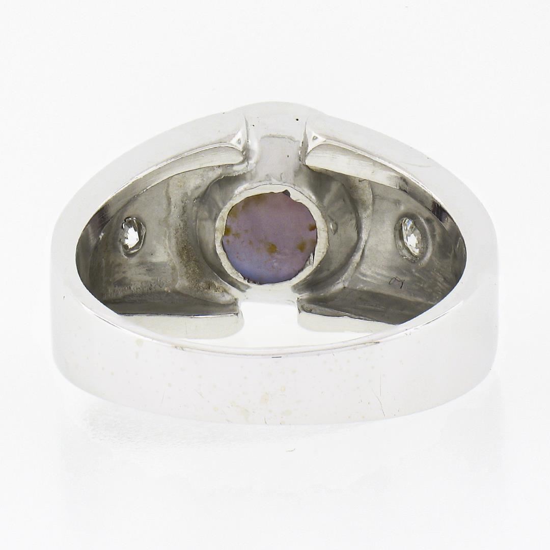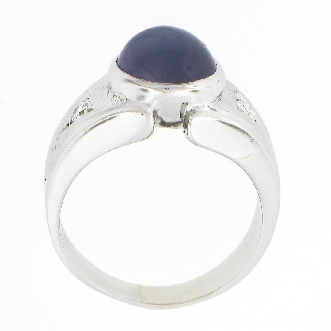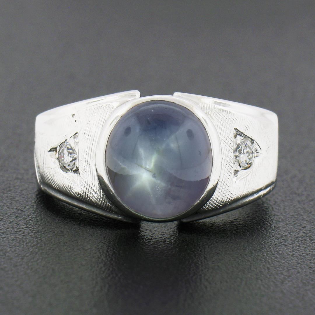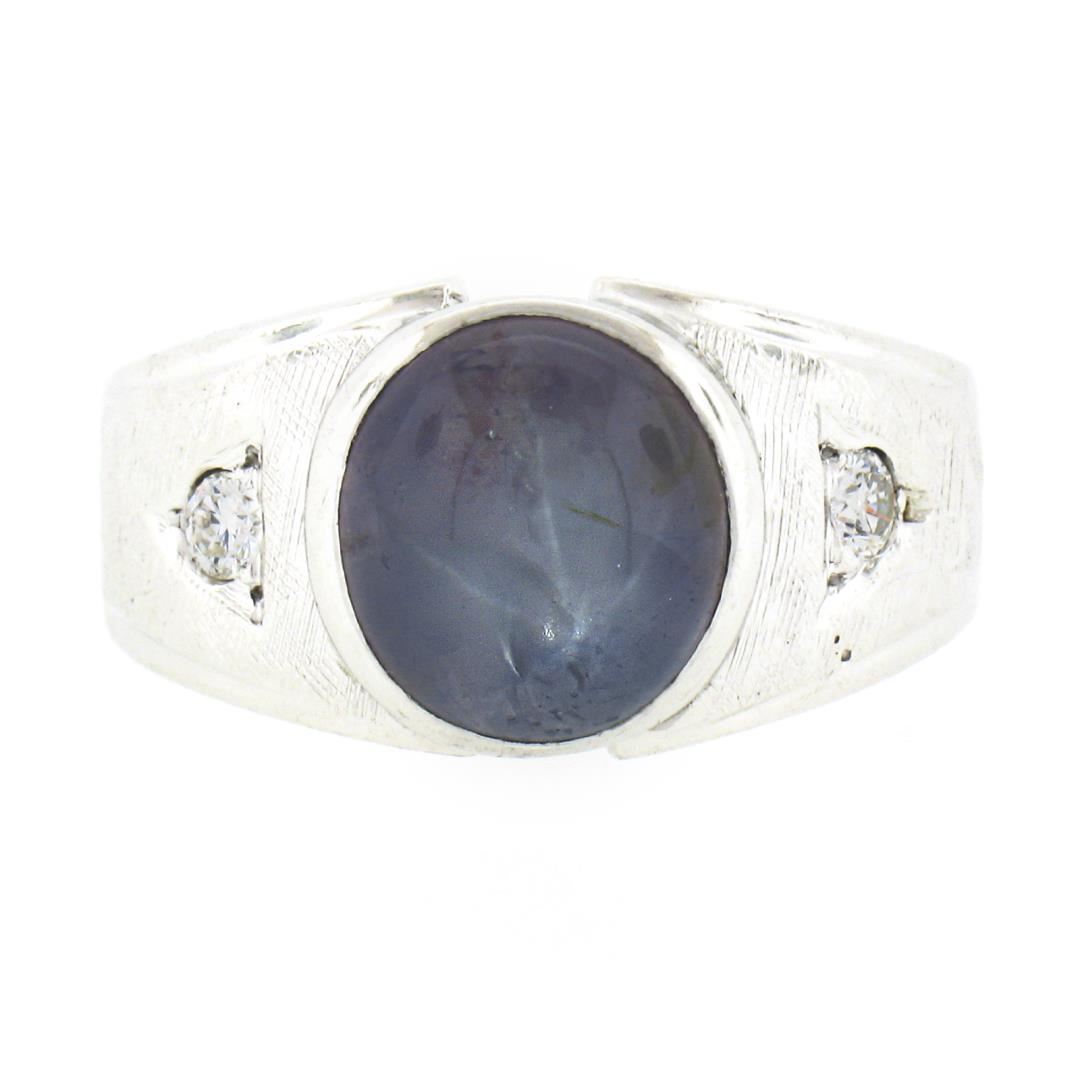 a vintage solid 14k white gold men's ring, with 1 oval cabochon cut natural star sapphire (10.1x9.0x6.5mm / 6.30ct), and 2 round brilliant cut natural diamonds (G/H - VS1/VS2 ; 0.14ctw). The ring is size 8.0, weighs a total of 9.13 grams, and measures 11.45mm wide.