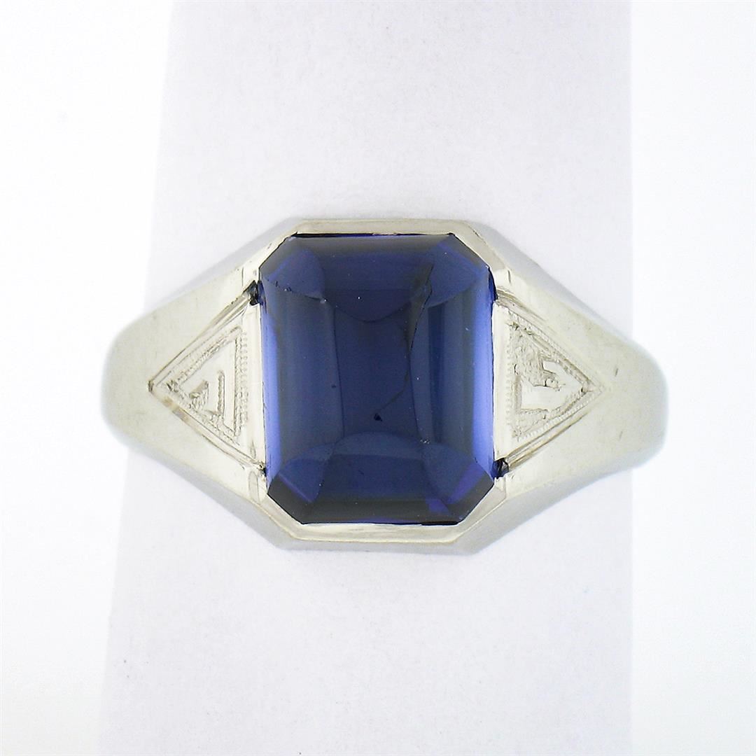 A vintage solid 14k white gold men's band ring, with 1 custom rectangular cabochon cut blue stone (9.8x8.0mm). The ring is size 7.5, weighs a total of 5.15 grams, and measures 11.45mm wide.