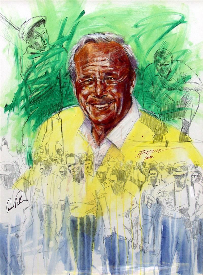 "Arnie's Army" by Michael Bryan is a Handsigned Original mixed media on canvas on 26"X 48" signed by Palmer in ink, and by the Artist.