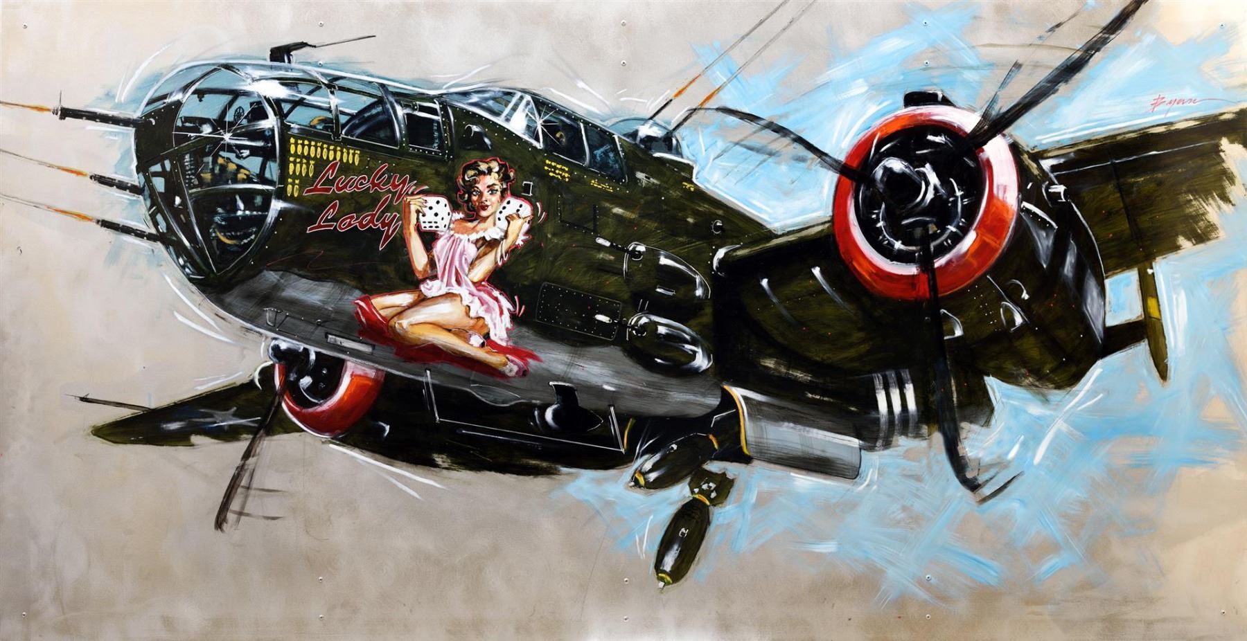 Michael Bryan's "Lucky Lady" is an 53x27.5" hand-pulled lithograph on arches paper, 1/1 Legendary WWII B-24 bomber, with its Lucky Lady holding a luck pair of dice . Printed on a 100 yeaqr old lithographic press