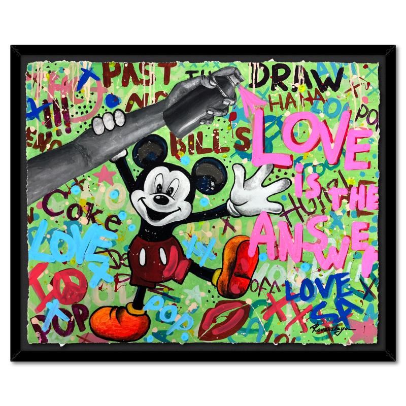 "Mickey Mouse In Love" is a one-of-a-kind mixed media on deckle edge paper by Nastya Rovenskaya; hand signed by the artist. This piece comes custom framed and includes letter of authenticity. Measures approximately 30" x 36" (framed), 24" x 30" (image).