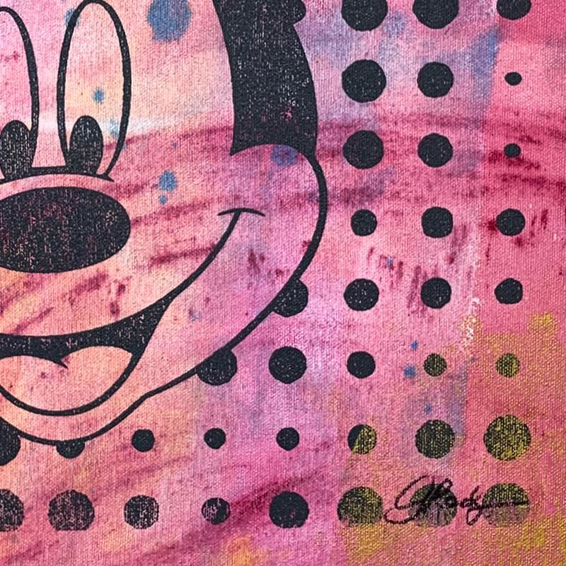 "Mickey Mouse" is an original hand pulled silkscreen and acrylic painting on canvas by Gail Rodgers. Hand signed by the artist, the piece comes with a letter of authenticity. This piece is meant to be gallery wrapped and measure approximately 23" x 23" and image dimensions (after stretching) 16" x 16" (image).