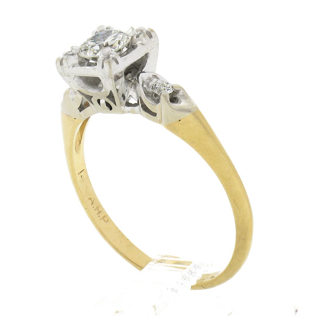 A vintage solid 14k yellow & white gold engagement ring, with 1 old european cut & 2 round cut natural diamond (G/H - VS1/VS2 ; 0.52ctw). The ring is size 8.5, weighs a total of 2.82 grams, and measures 6.8mm wide.