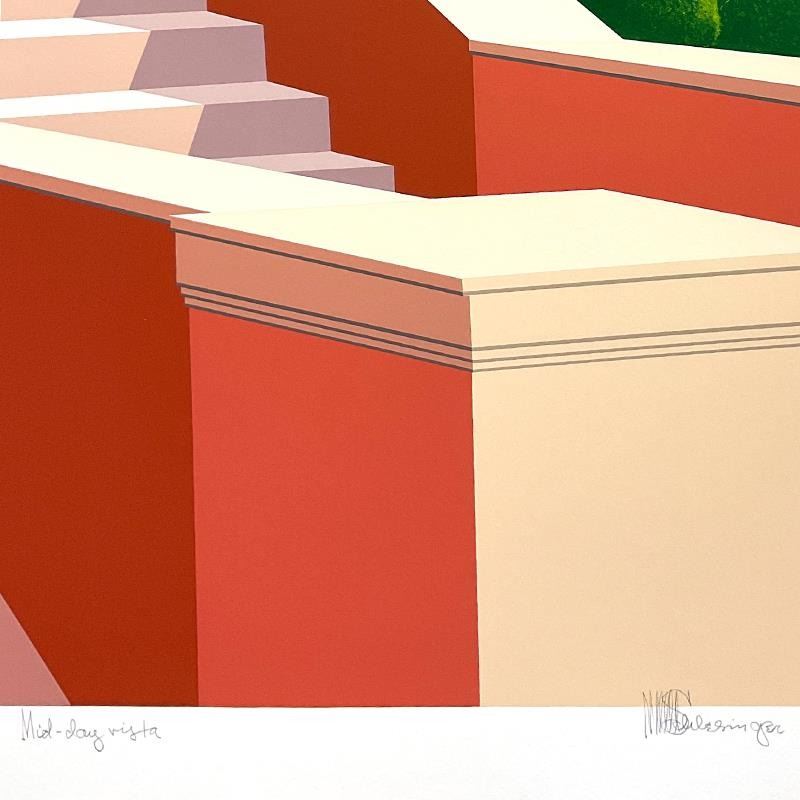 "Mid-Day Vista" is a limited edition serigraph on paper by William Schlesinger (1915-2011), numbered and hand signed by the artist. Includes Letter of Authenticity. Measures approx. 35.5" x 42" (border), 30" x 36" (image). Due to the age of this piece there may be very minor imperfections on the paper.