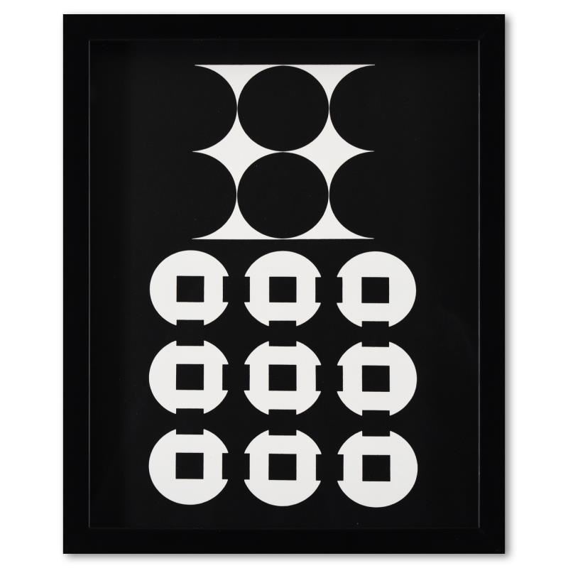 "Mimas et Canopus de la serie Corpusculaires (Diptych)" is a set of heliogravure prints on paper published in 1973 by Victor Vasarely (1908-1997). These pieces come custom framed with a letter of authenticity and with a 1976 Vasarely paperback. Measures approx. 12.5" x 15" (frame) 10" x 13" (image).