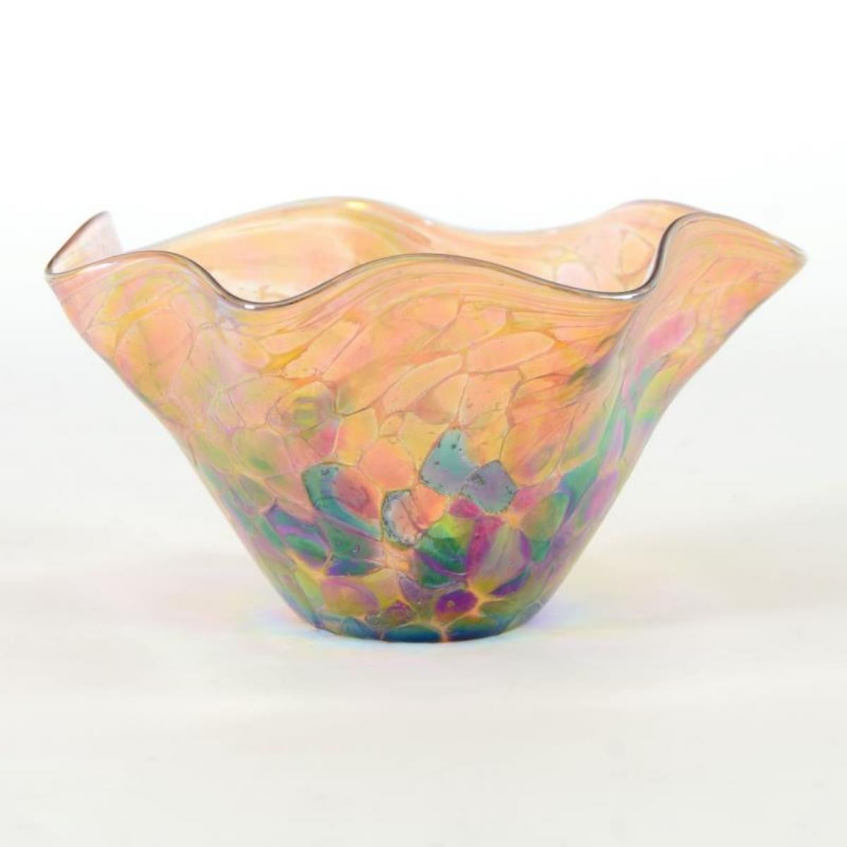 "Mini Wave Bowl (Island Mix)" is a hand blown glass bowl (second) from Glass Eye Studios. This piece contains ash from the 1980 volcanic eruption of Mount St. Helens. As each piece is individually handcrafted, the pattern in the glass may vary slightly from the image shown. "Second" means very slightly imperfect, but still great quality. Measures approx. 6" x 3".