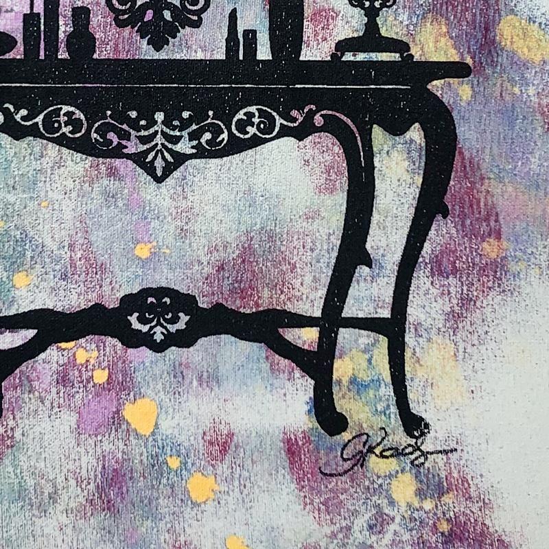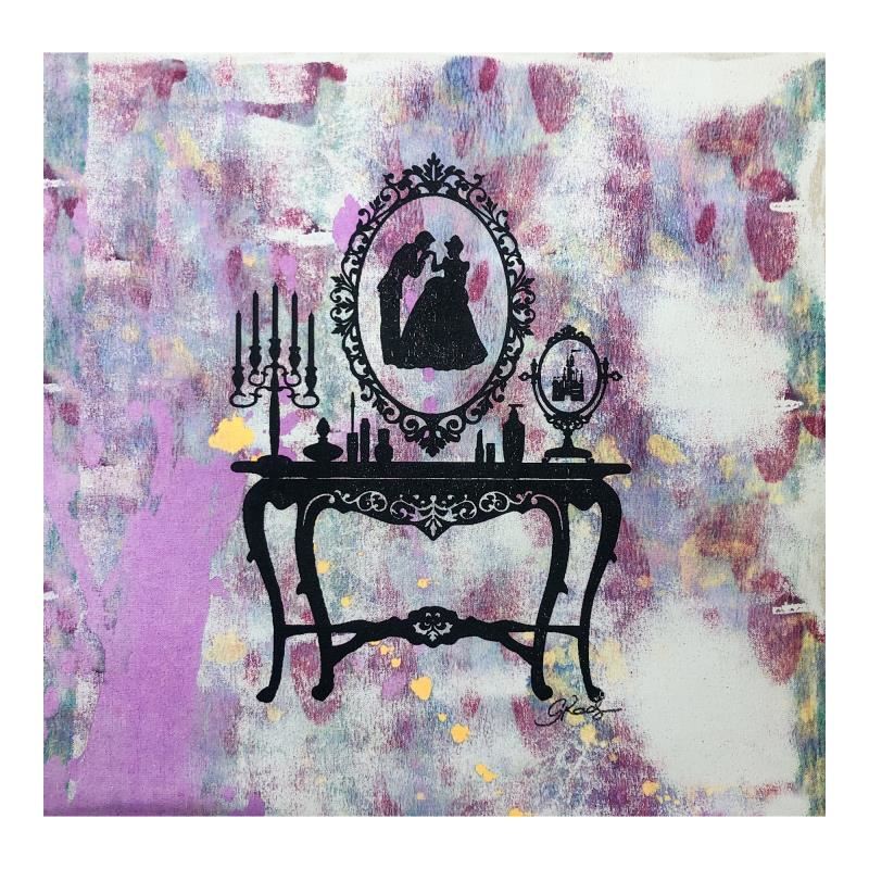 "Mirror Mirror (Cinderella)" is an original hand pulled silkscreen and acrylic painting on canvas by Gail Rodgers. Hand signed by the artist, the piece comes with a letter of authenticity. This piece is meant to be gallery wrapped and measure approximately 23" x 23" and image dimensions (after stretching) 16" x 16" (image).