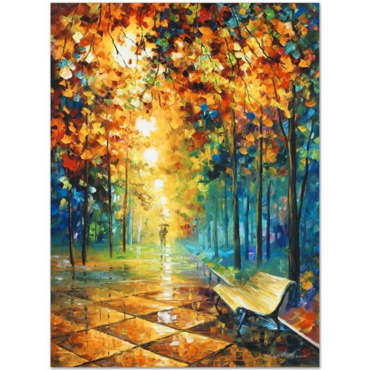 Leonid Afremov's (1955-2019) masterful use of color and texture make his paintings unique collectibles that are sure to brighten any wall. "Misty Park" is a limited edition giclee on canvas. The piece is numbered and bears the artist's authorized signature. This piece comes gallery wrapped. Includes Letter of Authenticity. Measures approx. 18" x 24" (image).