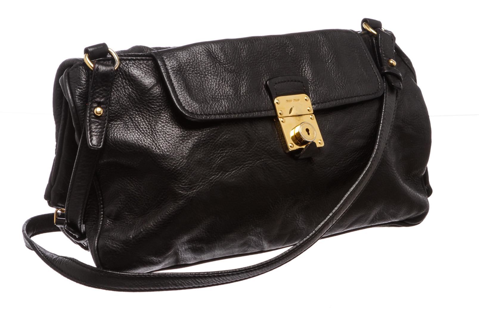 Overall flap over zip top closure, dual rolled handles, and gold tone hardware. Interior is black fabric lined with one zip pocket.