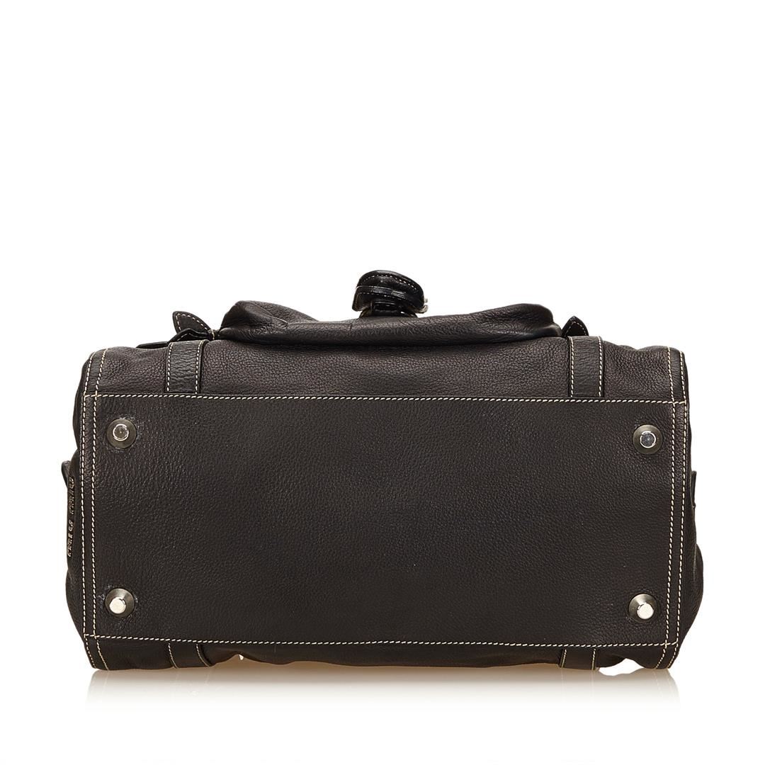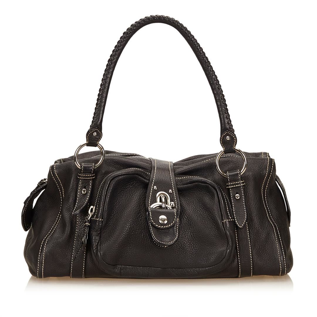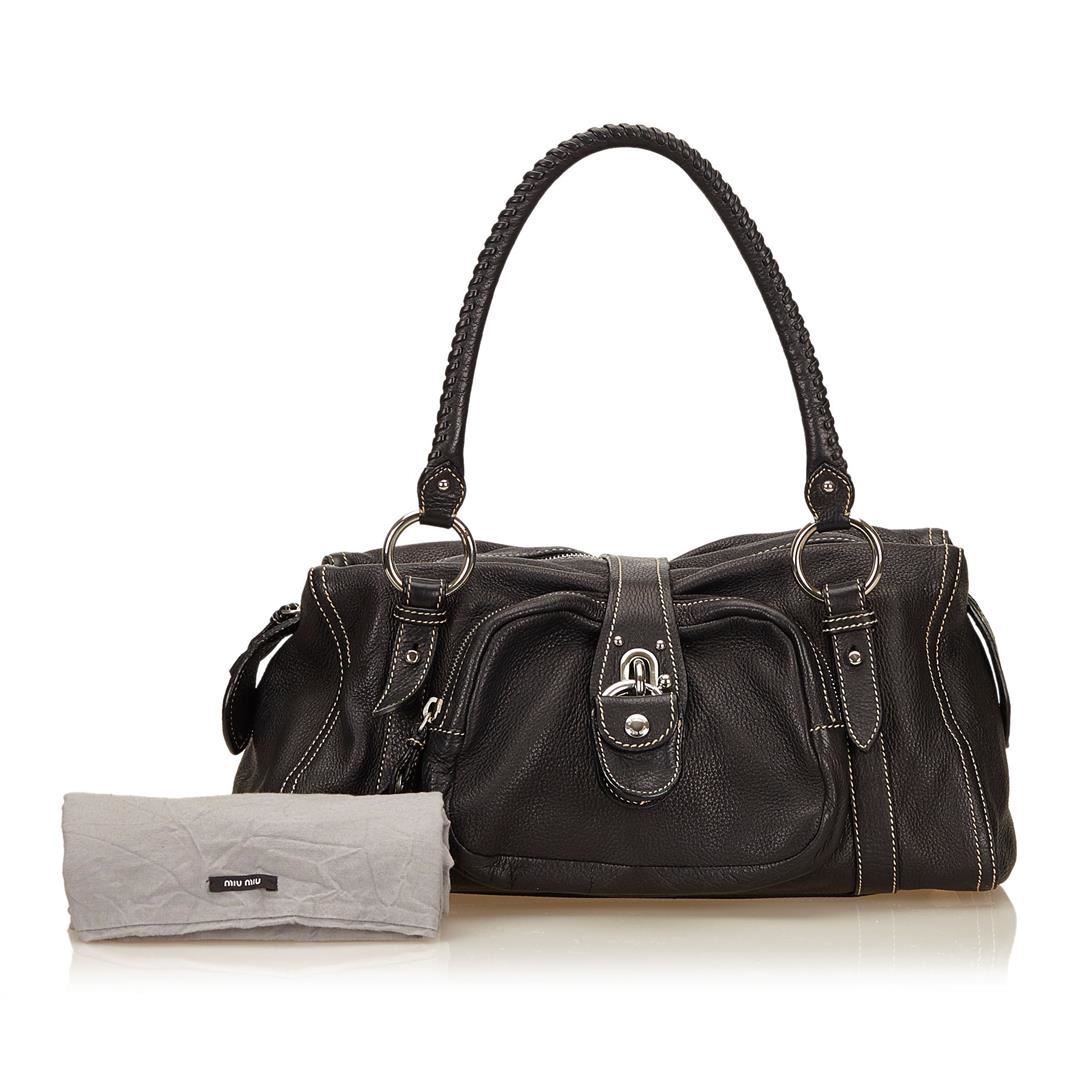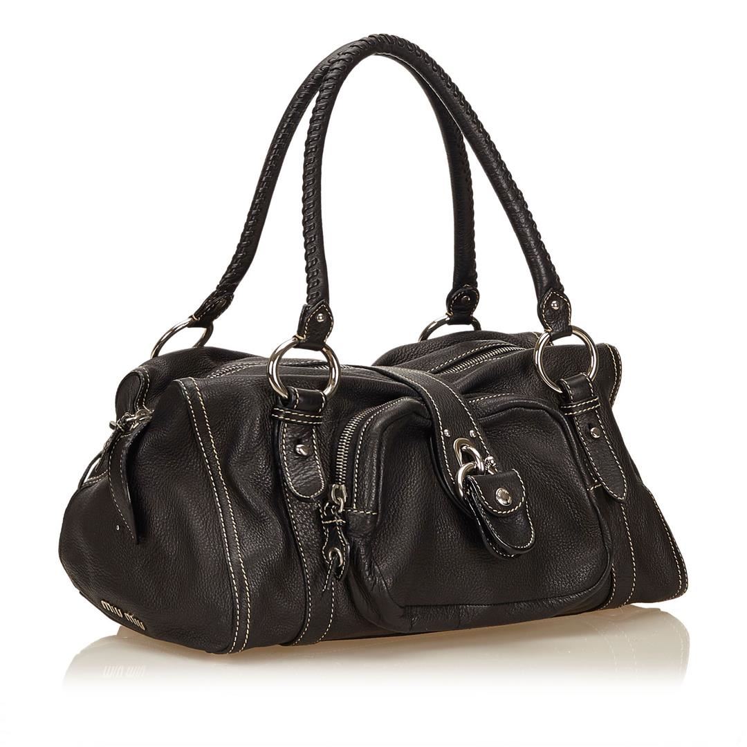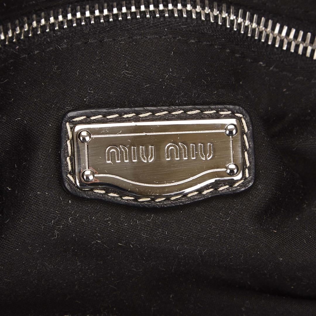 One Miu Miu Leather Shoulder Bag. This shoulder bag features a leather body, front exterior zip pocket, rolled leather handles, and interior zip pocket.
