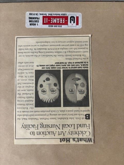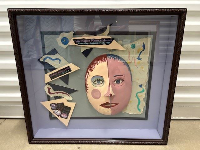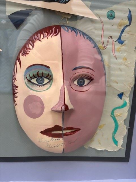 A Hand-painted Mixed Media Collage in a 24x30" shadow-box frame of a 12-inch porcelain mask created for Charity by President Gerald & Betty Ford, signed by them .