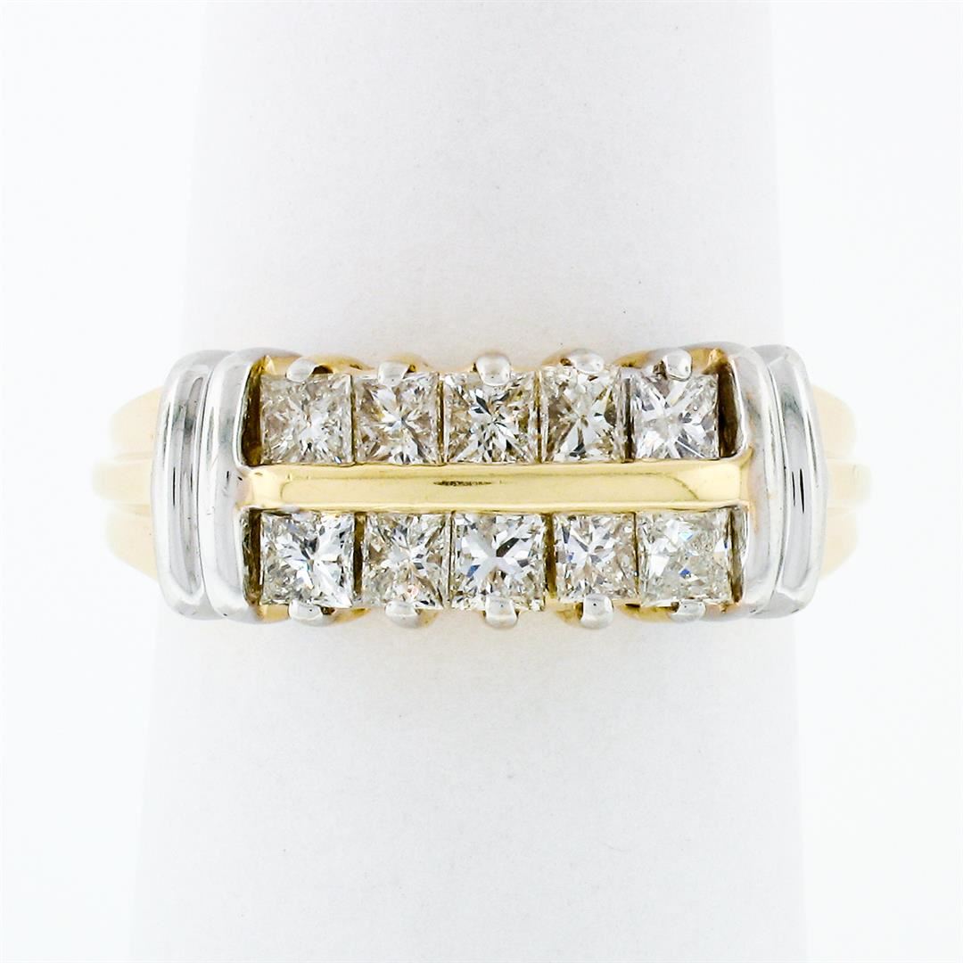 An estate solid 14k yellow & white gold wide band ring, featuring 10 princess cut natural diamonds (J/K Color - VS2-SI2 ; 1.10ctw). The ring is size 7, weighs a total of 4.85 grams, and measures 7.40mm wide.