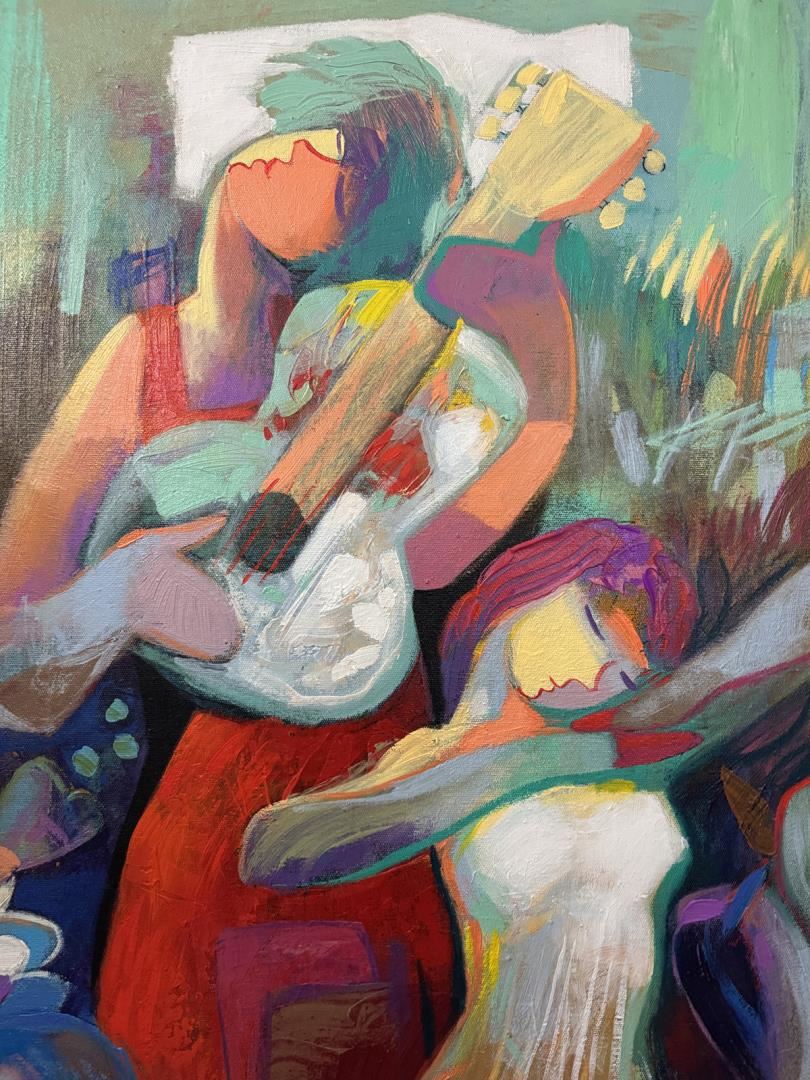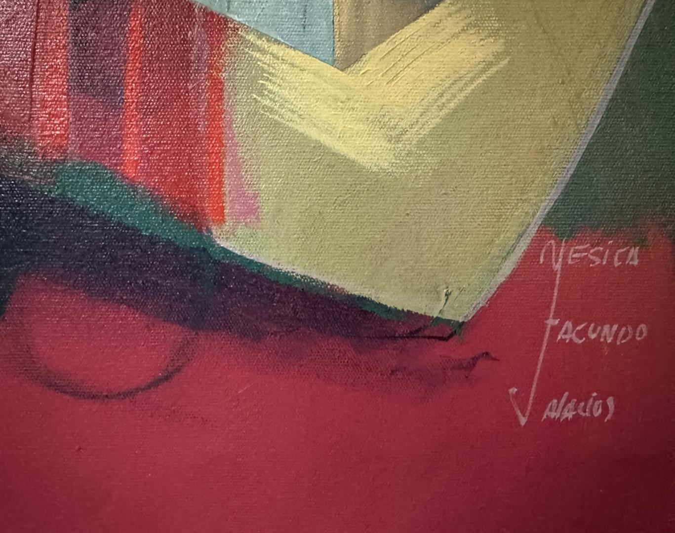 This exquisite original 45x60" acrylic artwork on canvas exemplifies the artist's mastery and creative vision. This hand signed piece comes framed ensuring a sophisticated presentation that is ready to hang.