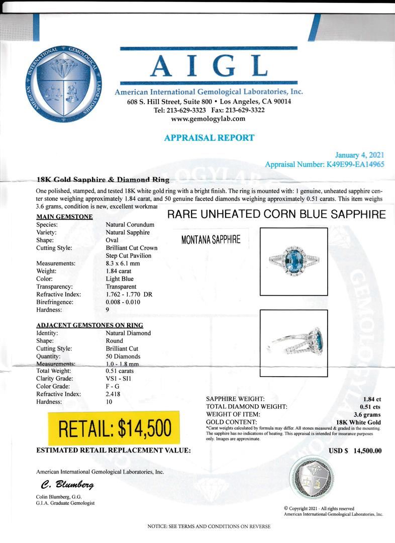 Montana Sapphire Ring (Unheated). Please see Photos and Description for all available information. This stunning sapphire ring features a beautiful 1.84ct Montana sapphire center stone, surrounded by 0.51ct round diamonds. This unheated sapphire is a truly rare gem that is found in the United States and is known for its blue color with a hint of violet.
