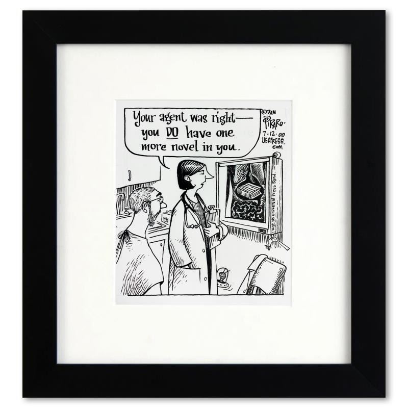 Enter a surreal and satirical world of twisted imagination and award winning creativity. "More Novel" is an original pen & ink drawing on paper by Dan Piraro, creator of the critically acclaimed and award winning comic strip, Bizarro. This piece is hand signed, comes custom framed and includes a letter of authenticity. Measures approximately 12" x 10" (frame), 6.5" x 5" (image).This item requires special handling and may have a longer than usual turnaround.