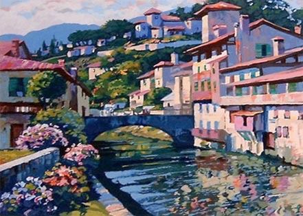 This French Village scene is a limited edition, signed and numbered serigraph on paper by Howard Behrens, with COA. 18 x 22