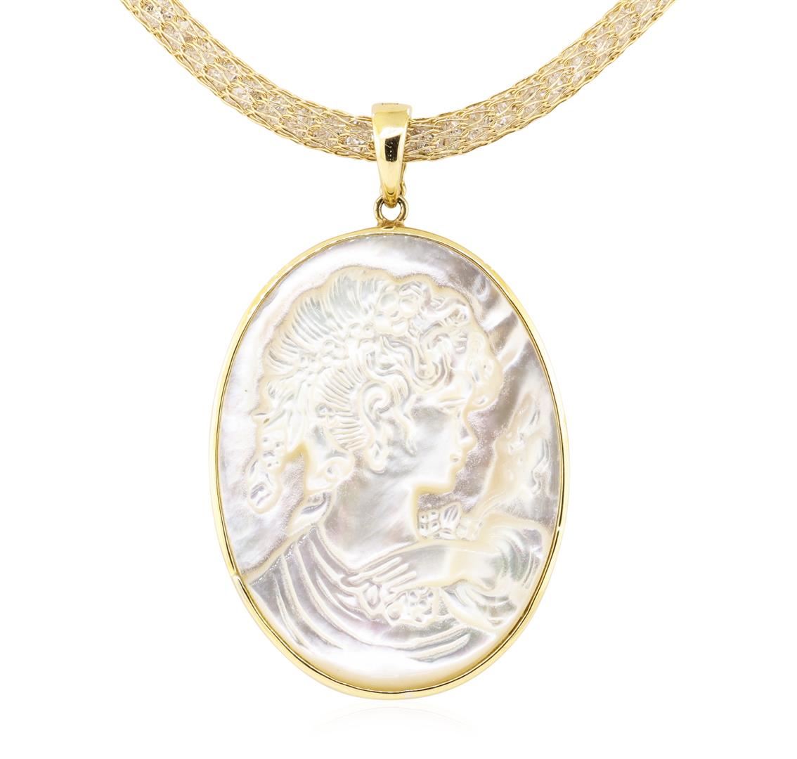 One mother of pearl oval shaped cameo pearl enhancer pendant measuring 40 by 30 millimeters with an attached 14KT yellow gold tube chain measuring nineteen and a half inches in length filled with cubic zirconias. The overall weight is 31.8 grams.