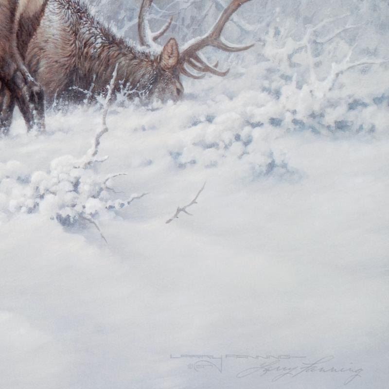 "Mountain Majesty - Bull Elk" is a limited edition lithograph on paper by Larry Fanning (1938-2014), numbered and hand signed with a Letter of Authenticity. Measures approximately 32.5" x 19.5" (image).