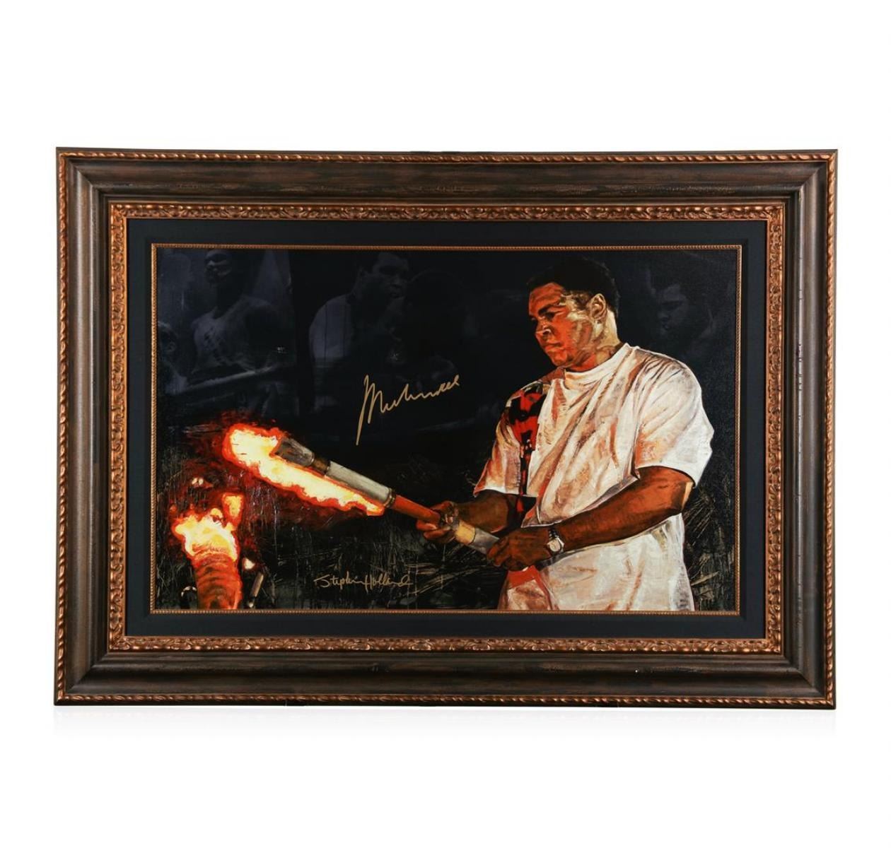 The most endearing moment of the 1996 Summer Olympics in Atlanta was perhaps its first moment - the lighting of the Olympic torch by Muhammad Ali. Noted sports artist Stephen Holland captures this moment with this 26" x 41" hand enhanced giclee. This limited edition rendition is signed very boldly in gold Sharpie "Muhammad Ali" above the torch, with the artist Stephen Holland signature down below. This Ali signature is likely the largest, boldest signature we have ever seen! Tremendous image of The Greatest!