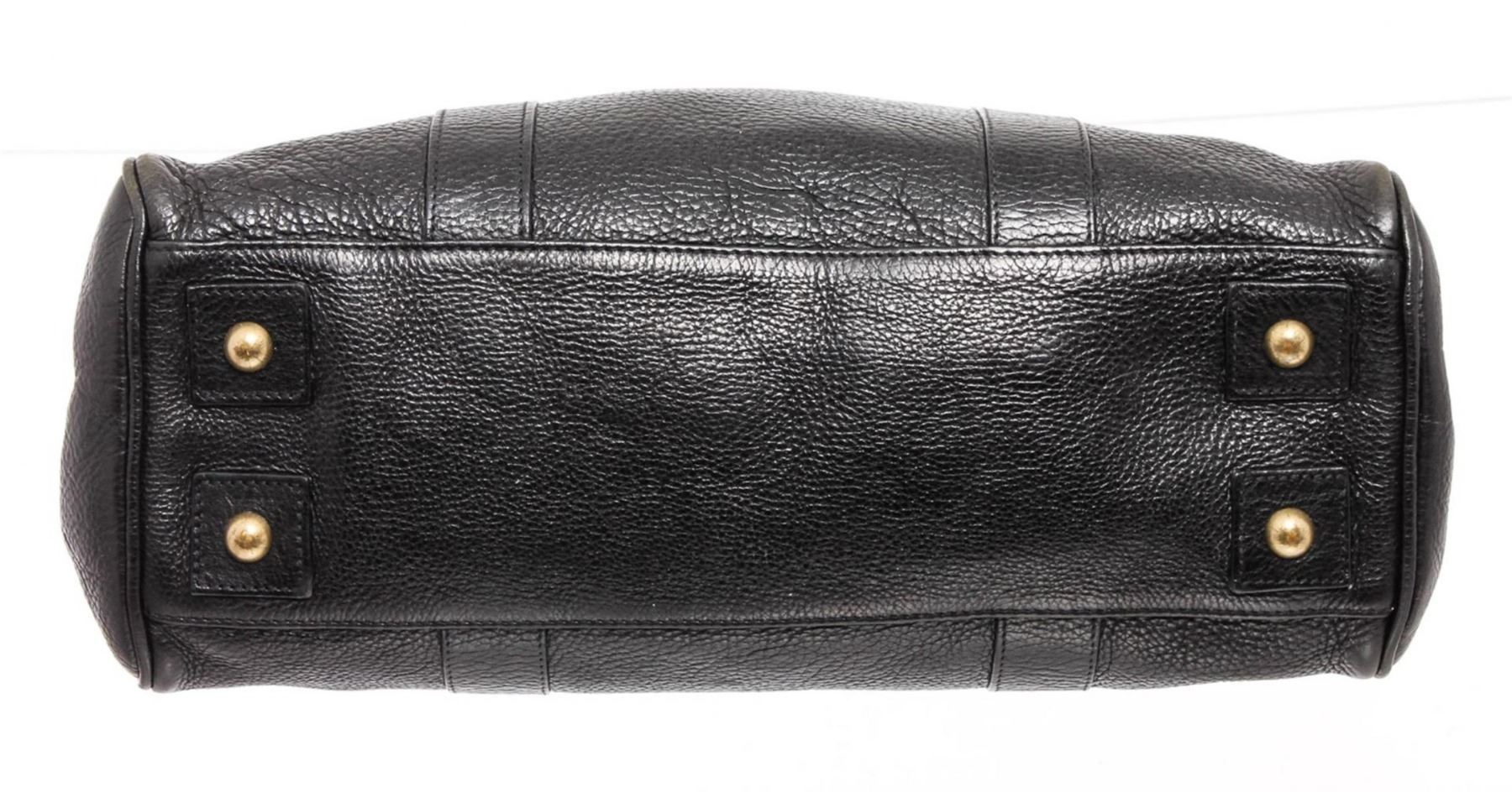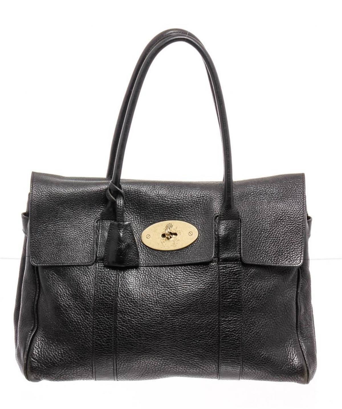 Mulberry black leather medium shoulder bag with gold-tone hardware, dual rolled top handles, protective feet at base, green suede lining, three interior pockets; one with zip closure and overall twist-lock closure at top.