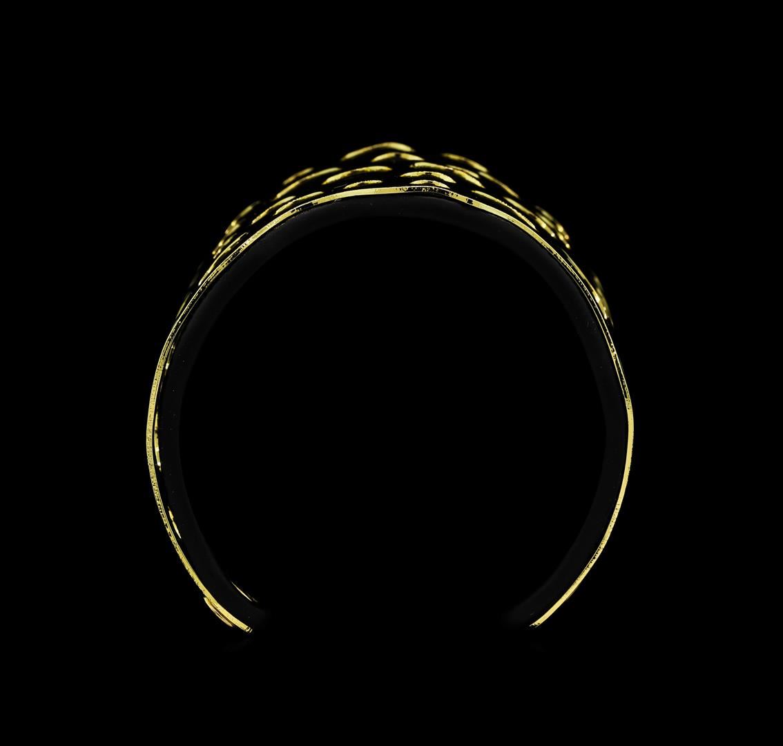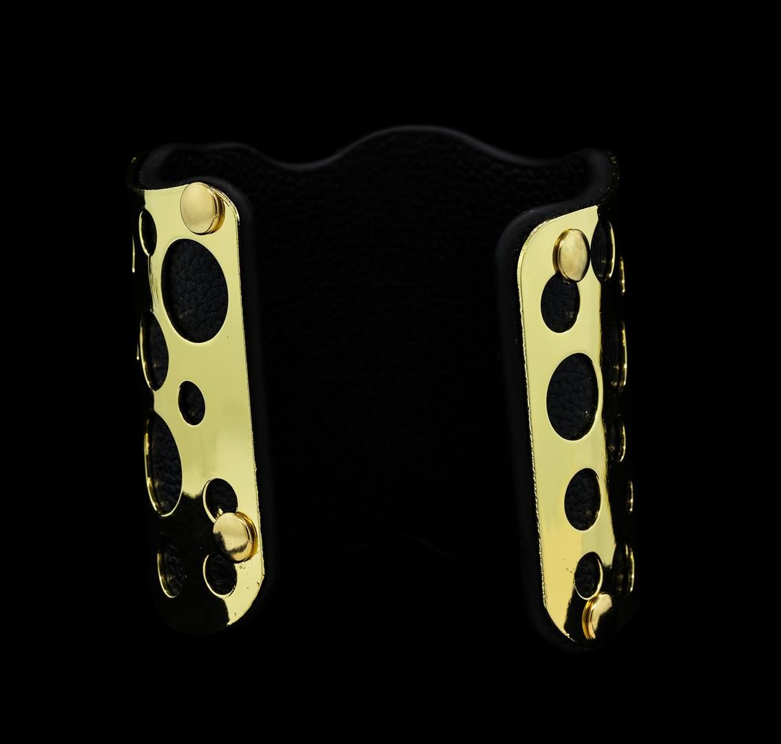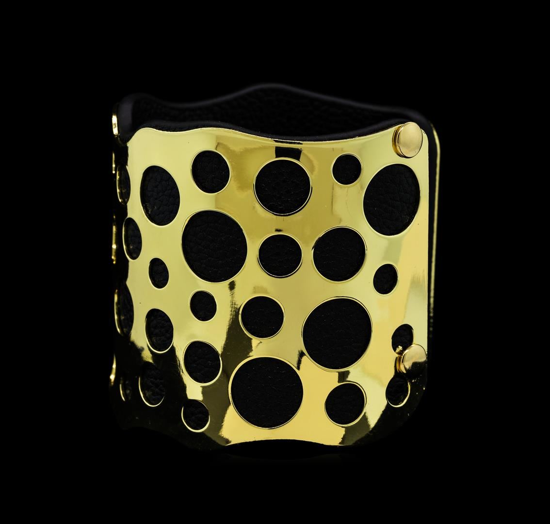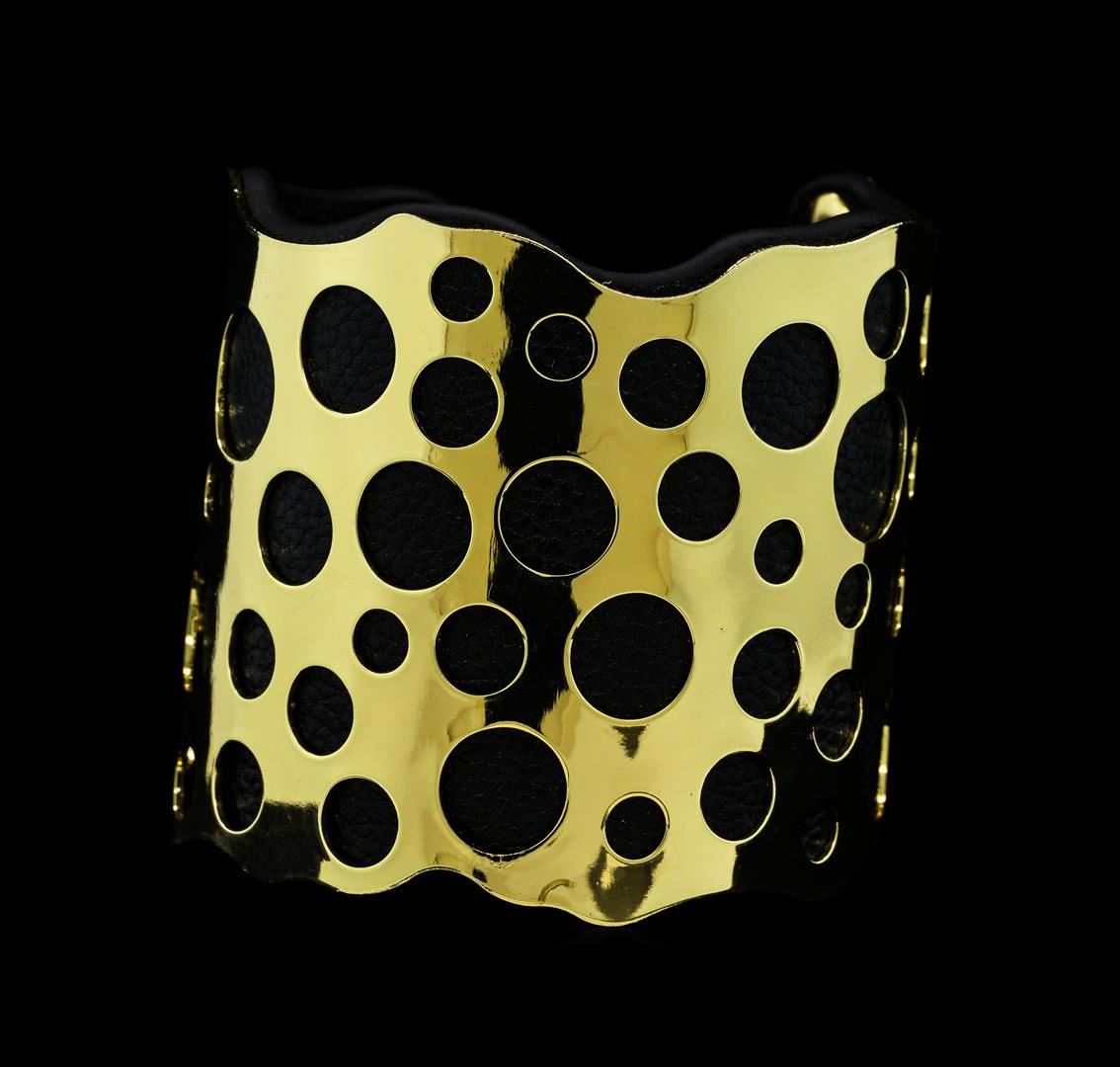 High end designer jewelry. Multi Circle Design Cuff Bracelet - Metal and Leather. Metal& Leather Bracelet. Black/ Gold. One Size.