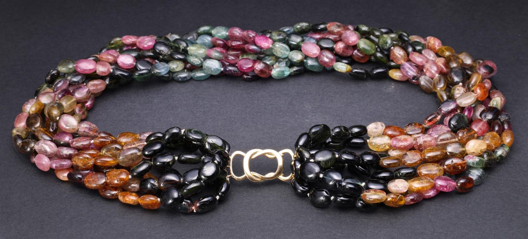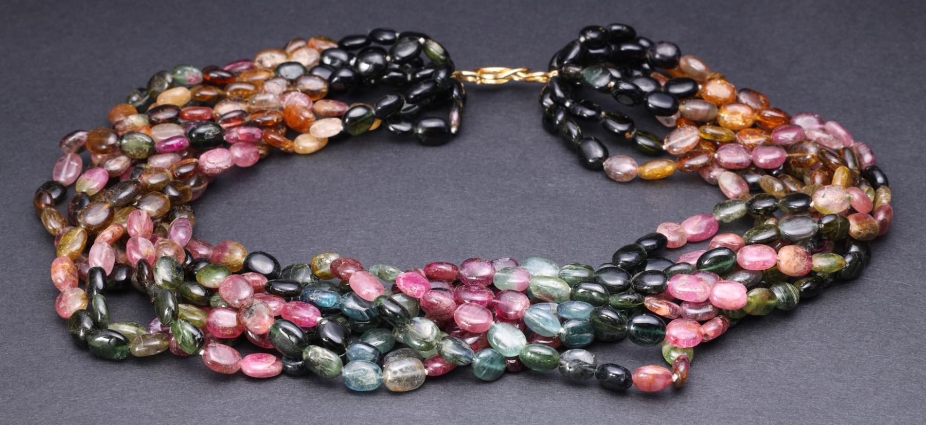 Multi-strand tourmaline bead necklace with a variety of colored beads with 14k yellow gold clasp, clasp marked 585; gross weight 145.9 g, length 16" (approx.)