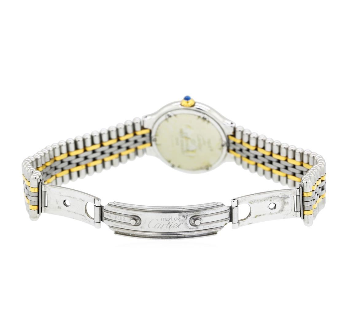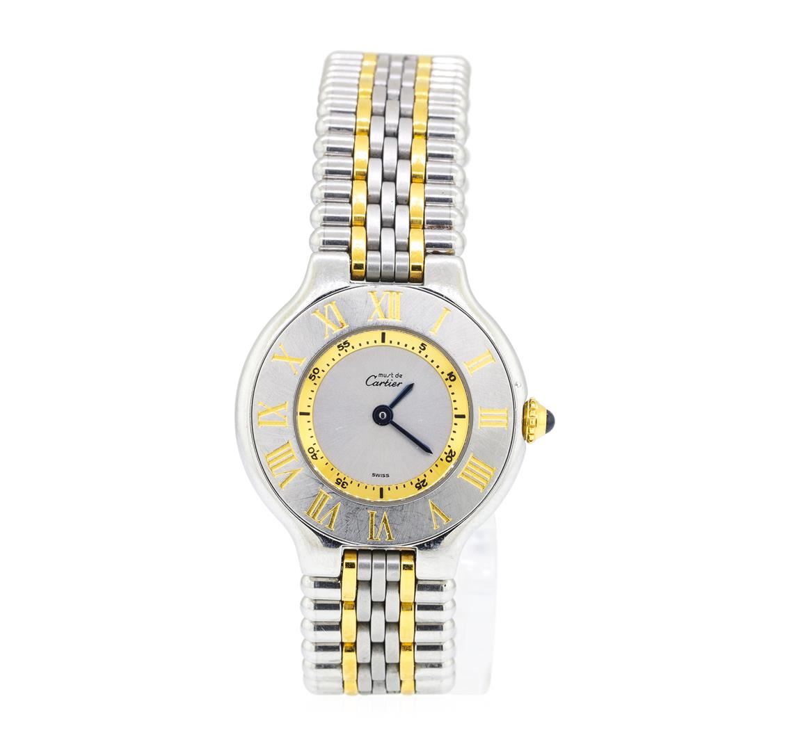 One Cartier "Must de Cartier" sterling silver and gold wristwatch with Roman numerals and a hidden double folding clasp. The crown is set with a blue cabochon stone. The watch is model number 1340, serial number PL46479.