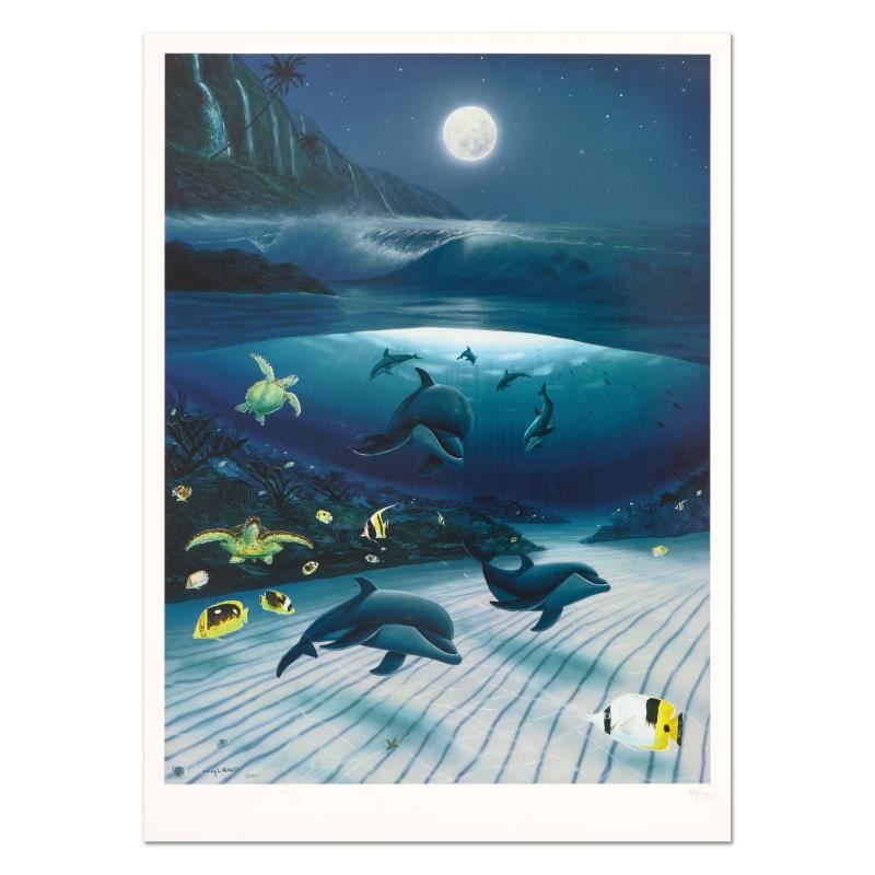 "Mystical Waters" is a limited edition lithograph on paper by Wyland, numbered and hand signed by the artist. Includes Certificate of Authenticity. Measures approx. 19.5" x 26.5" (border), 17.5" x 24" (image).