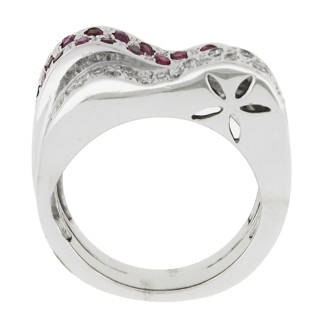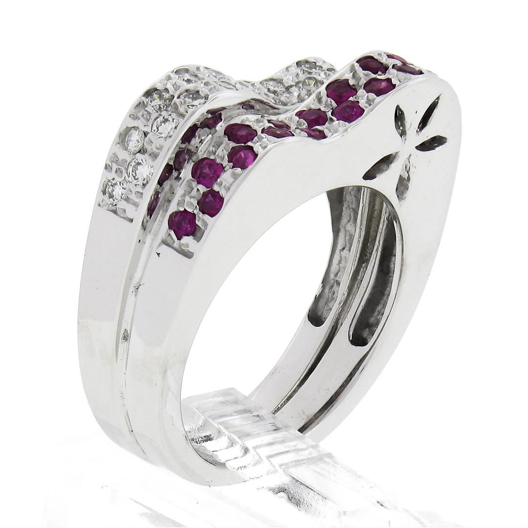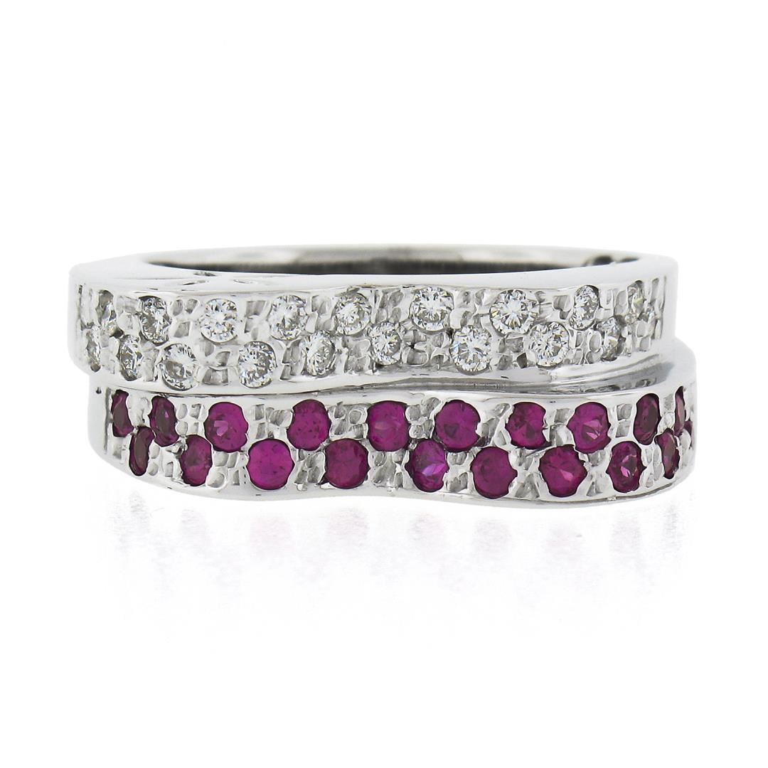 A new solid 14k white gold stack look wavy band ring, with 20 round cut natural diamonds (G/H - VS1/VS2 ; 0.30ctw), and 20 round cut natural rubies (0.55ctw ). The ring is size 6.5, weighs a total of 8.23 grams, and measures 7.5mm wide.