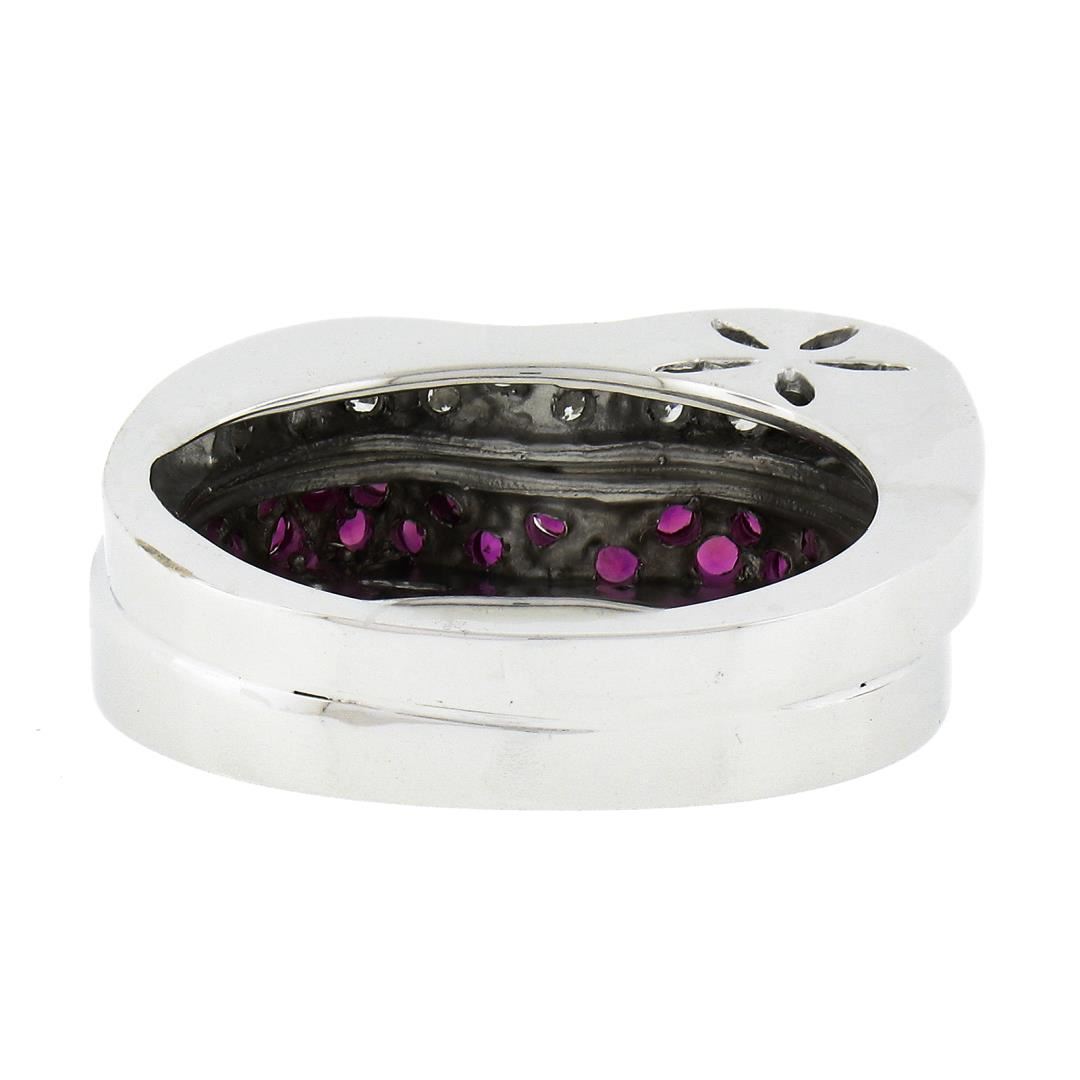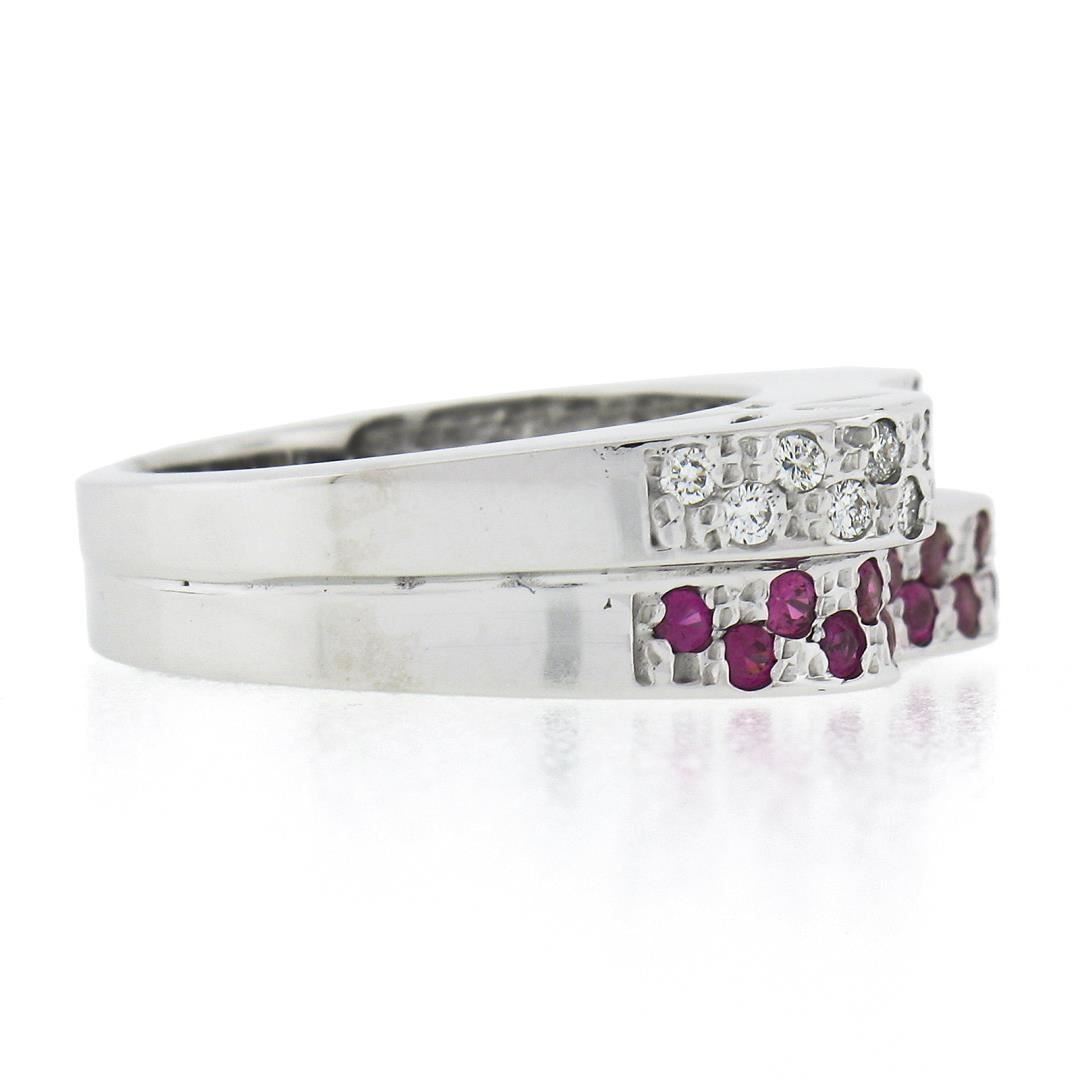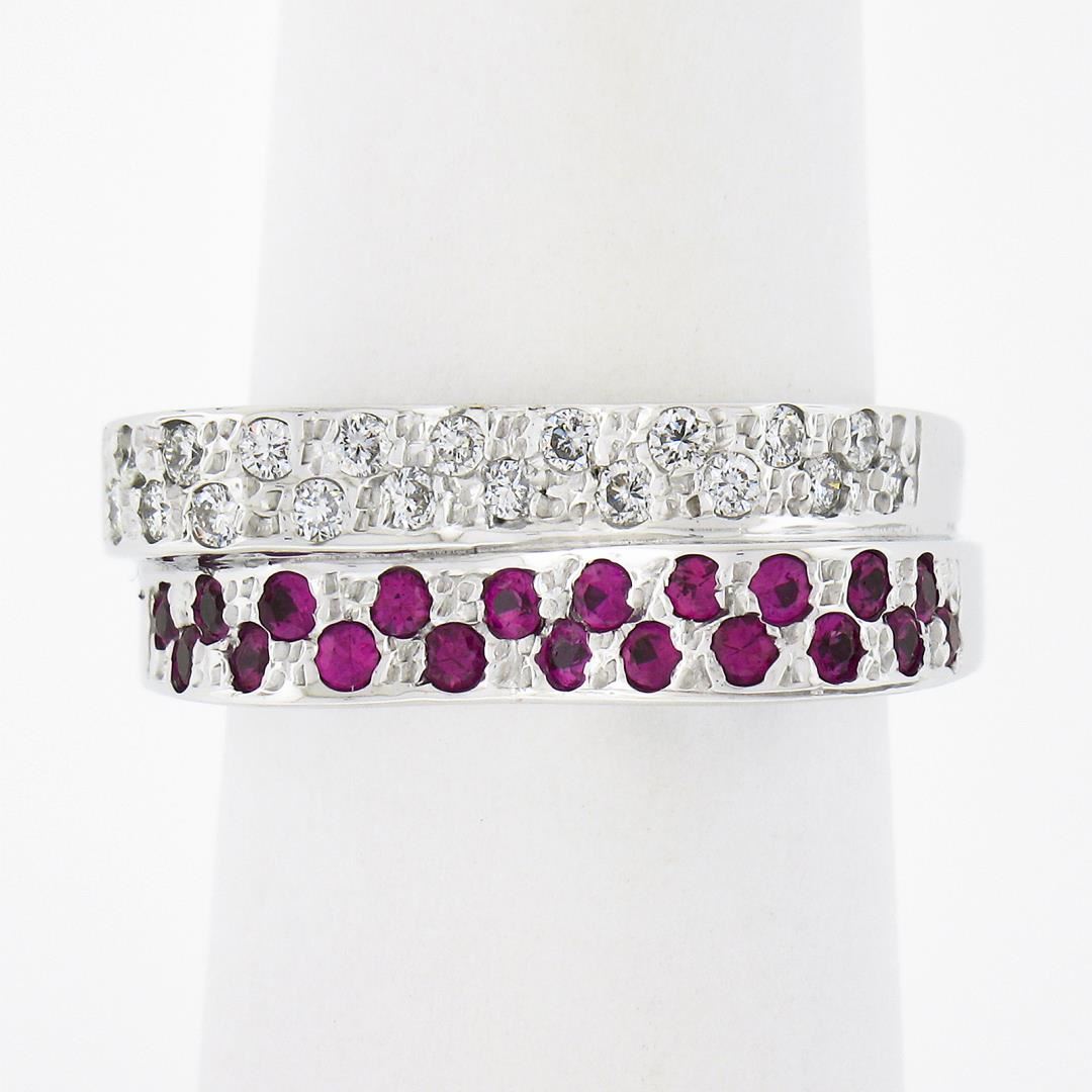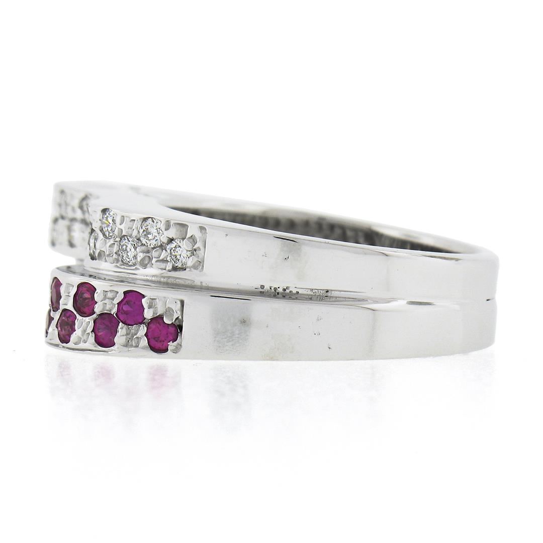 A new solid 14k white gold stack look wavy band ring, with 20 round cut natural diamonds (G/H - VS1/VS2 ; 0.30ctw), and 20 round cut natural rubies (0.55ctw ). The ring is size 6.5, weighs a total of 8.23 grams, and measures 7.5mm wide.