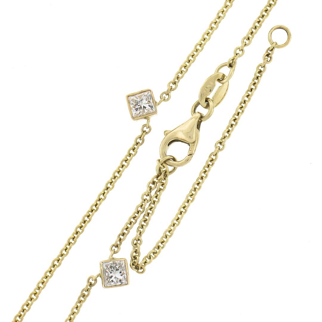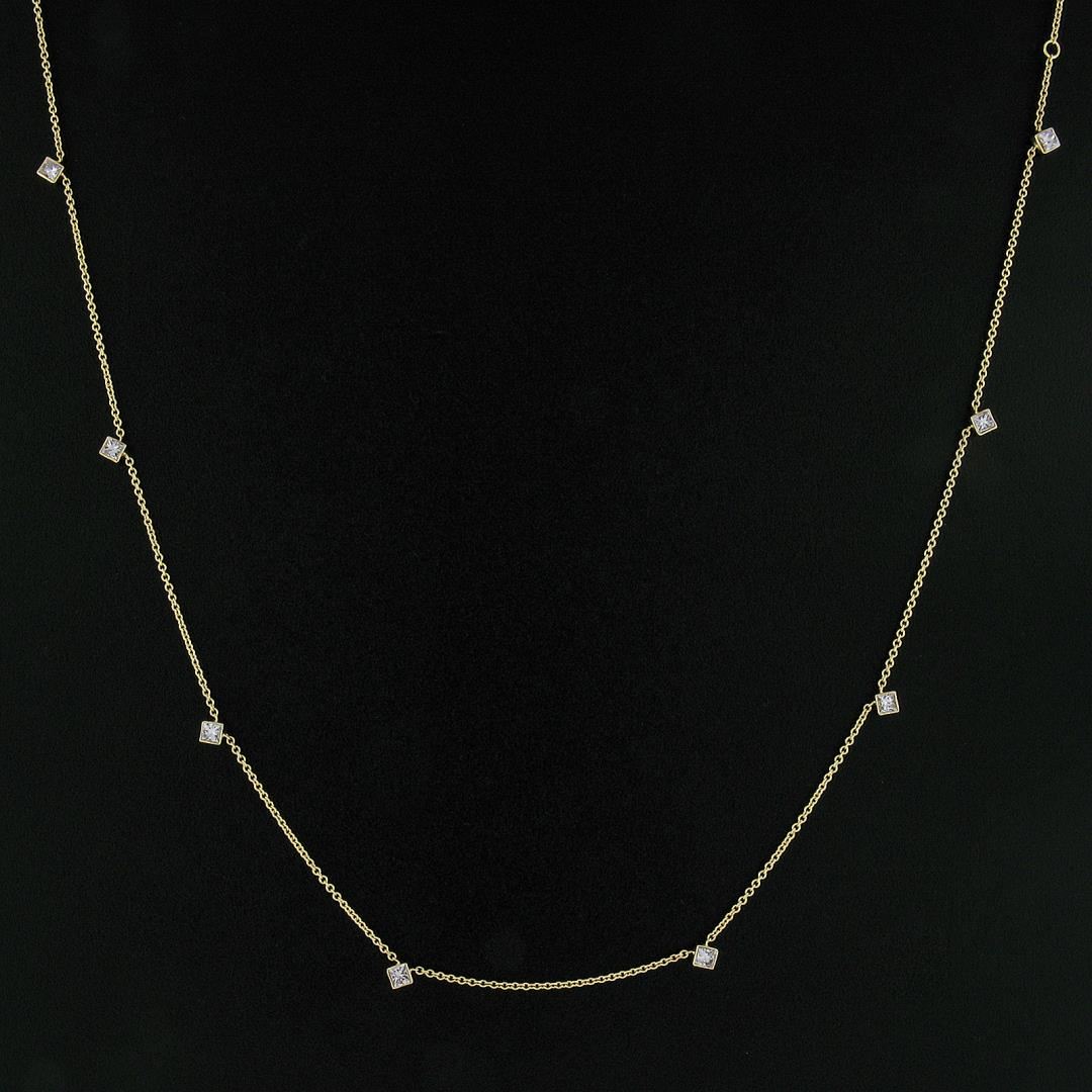 A new solid 14k yellow gold by the yard necklace, with 8 princess cut natural diamonds (G/H - VS1/VS2 ; 1.14ctw). It weighs a total of 3.45 grams, measures 4.6mm wide, and measures adjustable 16.5 & 18.5 inches in length.