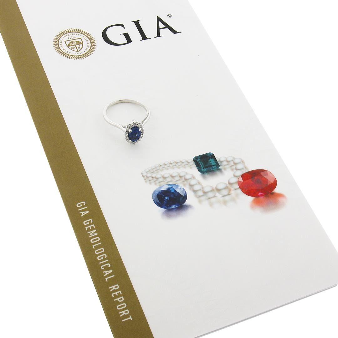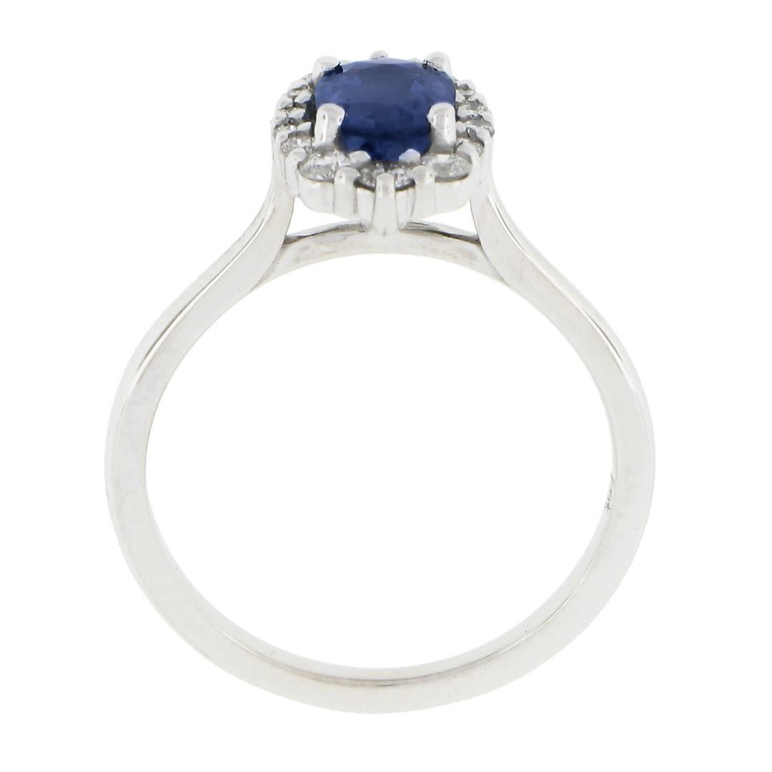 A new solid 14k white gold ring, with 1 GIA graded oval cut sapphire (1.28ct ), and a halo of 14 round cut natural diamonds (G/H - VS1/VS2 ; 0.30ctw). The ring is size 6.5, weighs a total of 3.16 grams, and measures 12.2mm wide. Comes with all original relevant certifications.