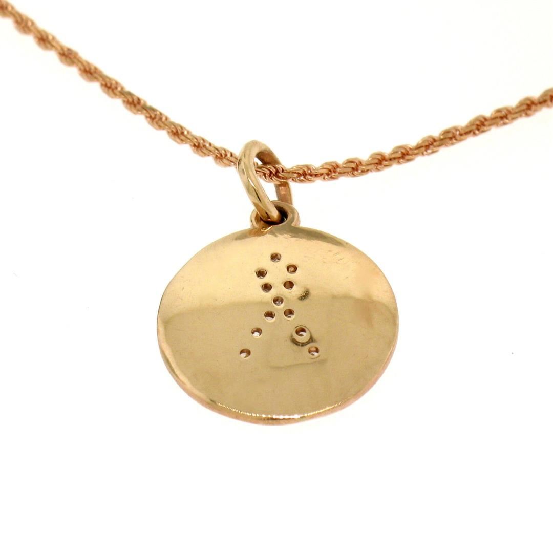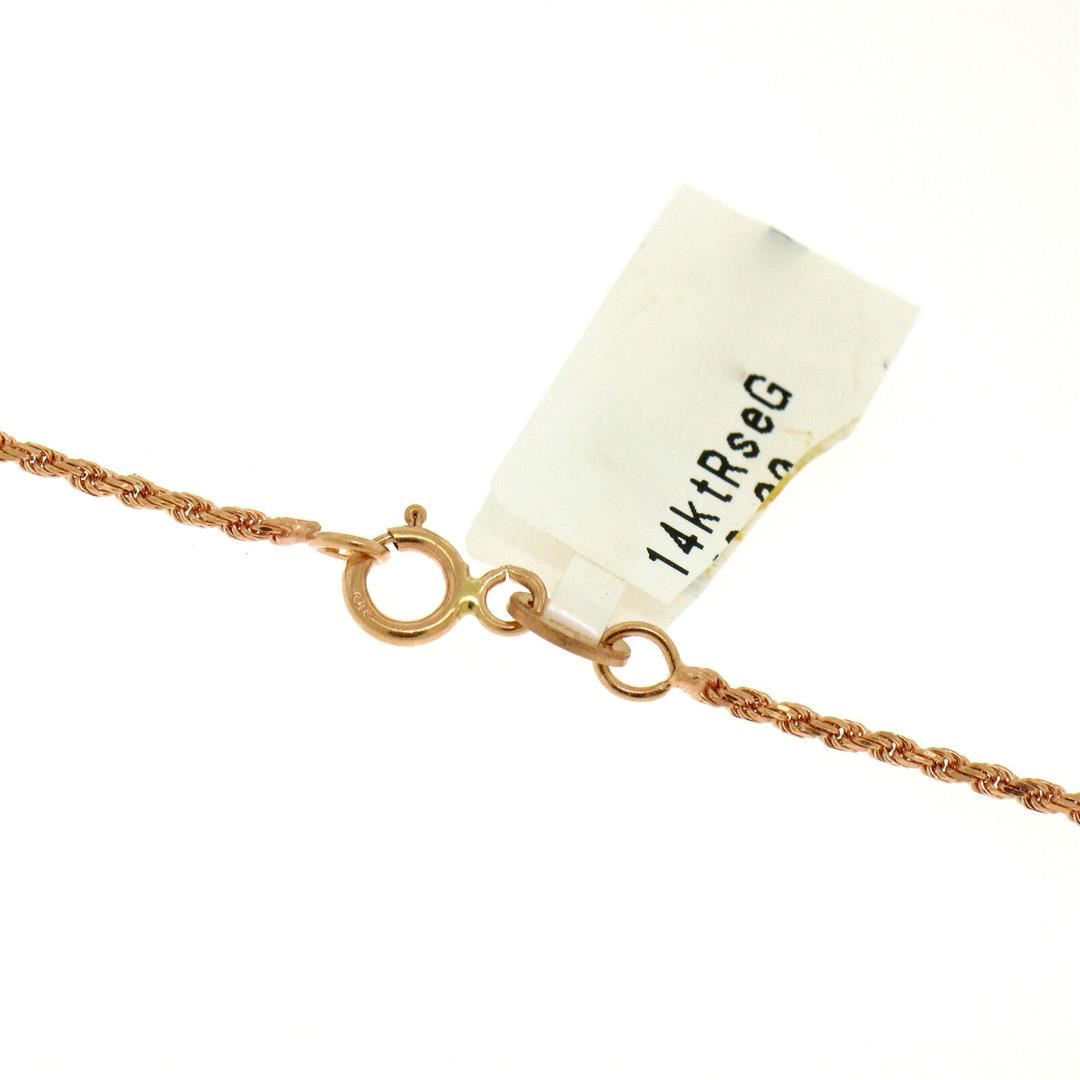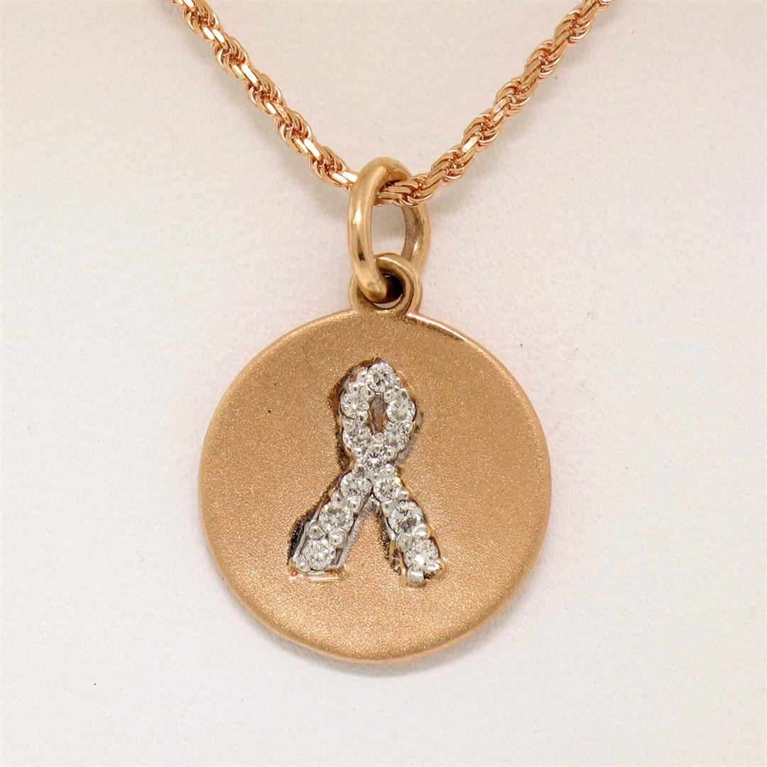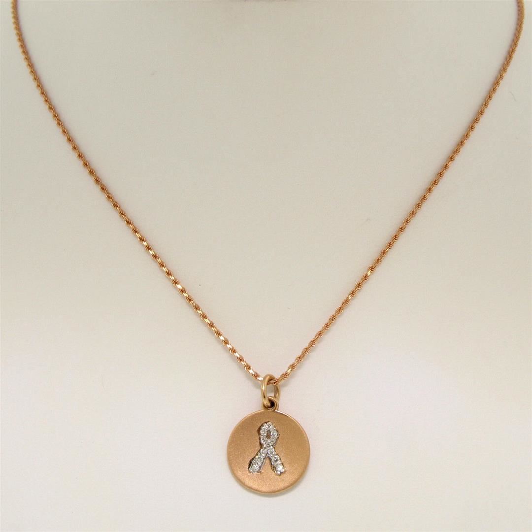 A new solid 14k rose gold pendant necklace, with 12 round brilliant cut natural diamons (G/H - SI1; 0.10ctw). 16 inch rope link chain, 5.1 grams total weight, pendant measures 21x14.8mm.