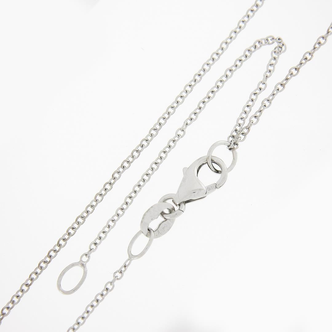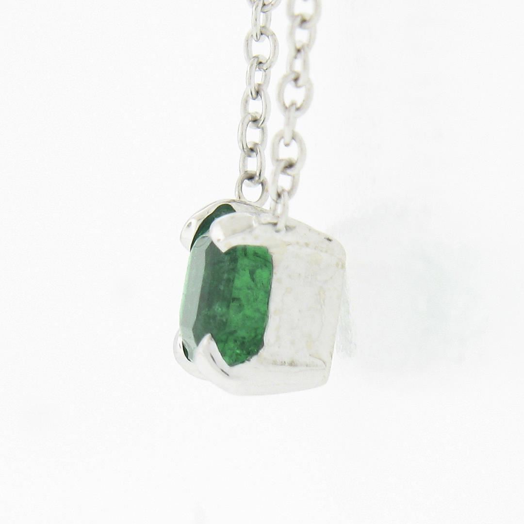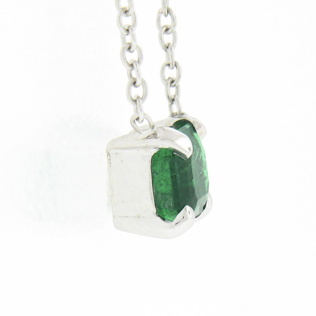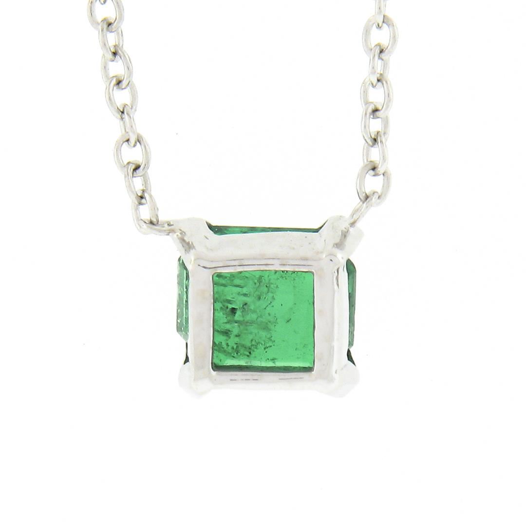 A new solid 14k white gold pendant necklace, with 1 emerald cut natural emerald (0.42 ct). Adjustable at 16 or 18 inch cable link chain, 1.72 grams total weight, pendant measures 5x5.4mm.