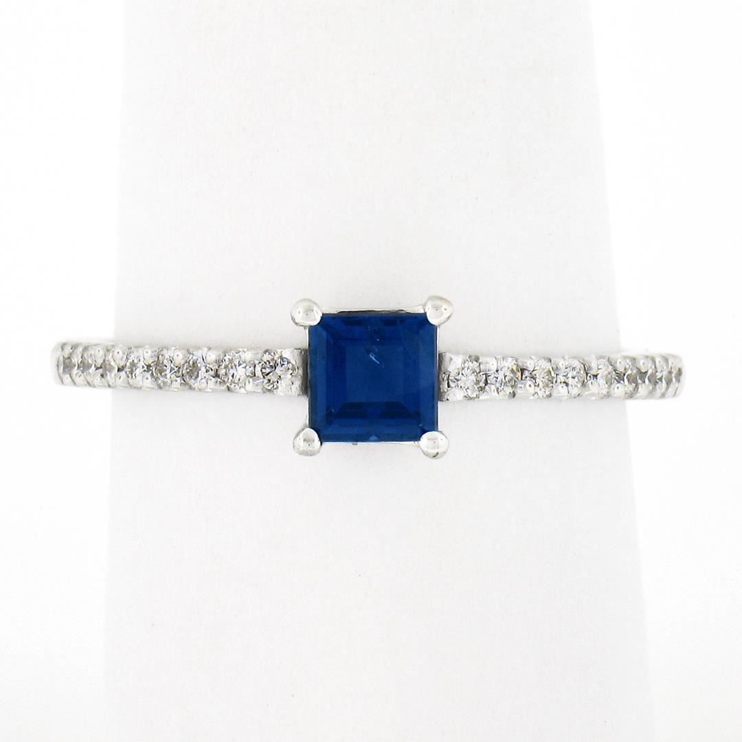 A new solid 14k white gold ring, with 1 square cut natural sapphire (0.45ct), and 18 round cut natural diamonds (F/G - VS1-VS2 ; 0.18ctw). The ring is size 7.5, weighs a total of 1.97 grams, and measures 5.35mm wide.
