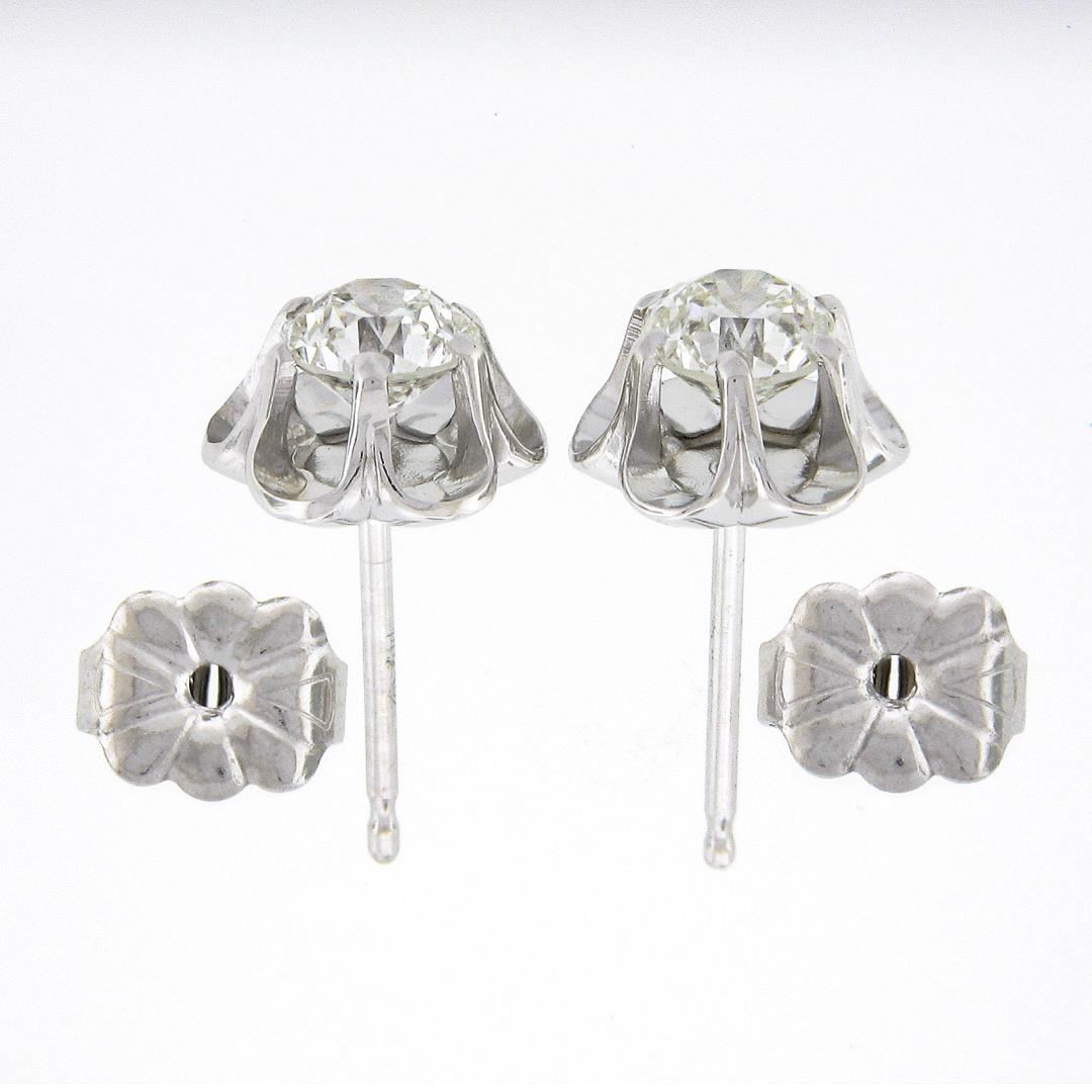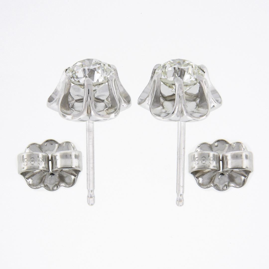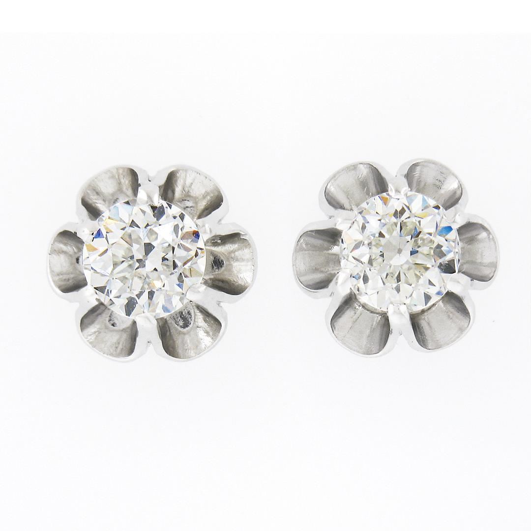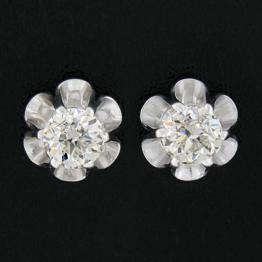 A new solid 14k white gold flower stud earrings, with 2 old European cut natural diamonds (H/I - VS1/VS2 ; 0.85ctw). The earrings measure approximately 7.9mm in diameter and weigh a total of 1.56 grams.
