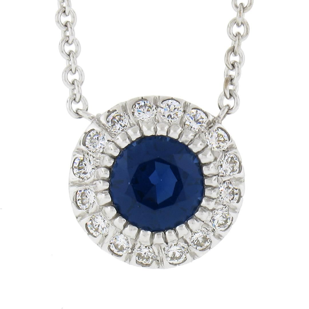 A new solid 14k white gold pendant necklace, with 1 round cut natural sapphire 0.82ctw(), surrounded with a halo of 13 round brilliant cut natural diamonds (G/H - VS1/VS2 ; 0.25ctw). 18.5 inch cable link chain, 3.70 grams total weight, pendant diameter measures 10mm.