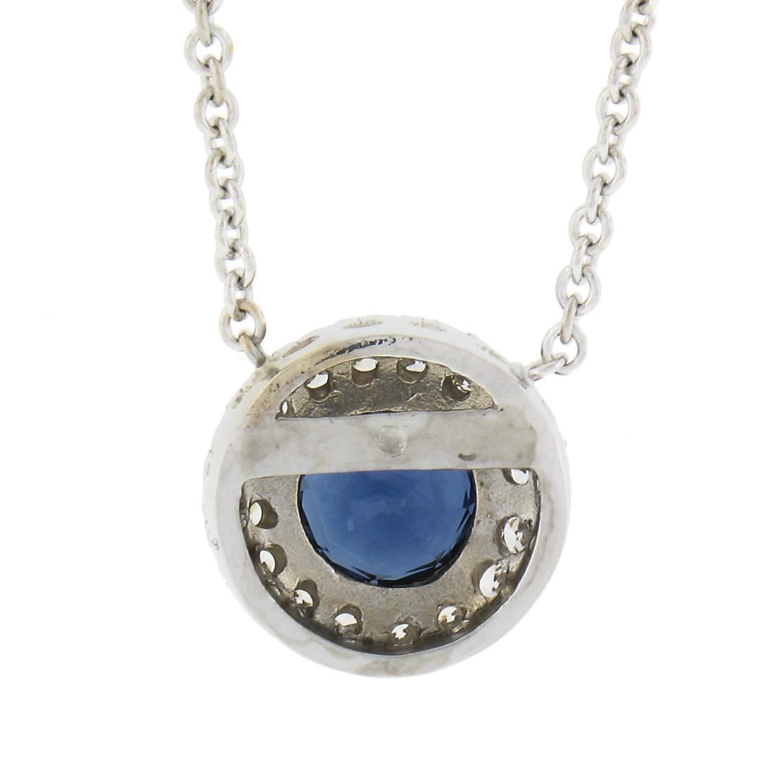 A new solid 14k white gold pendant necklace, with 1 round cut natural sapphire 0.82ctw(), surrounded with a halo of 13 round brilliant cut natural diamonds (G/H - VS1/VS2 ; 0.25ctw). 18.5 inch cable link chain, 3.70 grams total weight, pendant diameter measures 10mm.