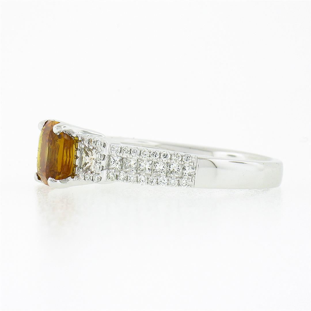 A new solid 14k white gold engagement ring, with 1 Gia certified octagonal cur natural orange sapphire (1.67ct ), and 14 princess cut natural diamonds (G/H - VS2/SI1 ; 0.50ctw), with 48 round brilliant cut natural diamonds (G/H - VS2/SI1 ; 0.50ctw). The