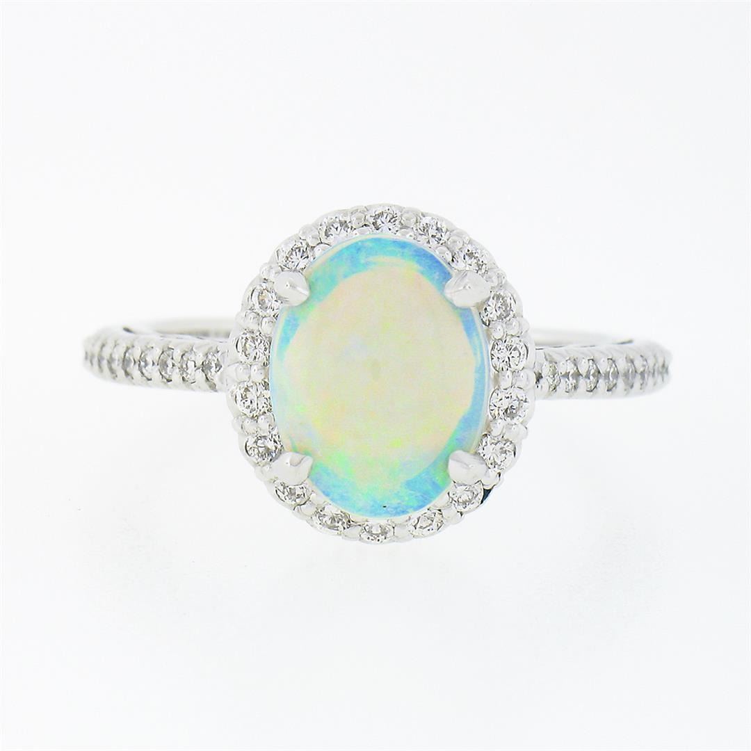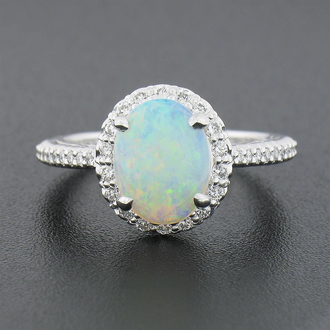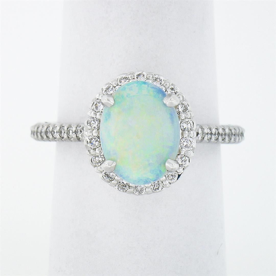 A new solid 14k white gold solitaire cluster ring, with 1 oval cabochon cut natural opal (10.3x8.0mm), surrounded with a halo of 36 round brilliant cut natural diamonds (F/G - VS1/VS2 ; 0.45ctw). The ring is size 7.0, weighs a total of 5.40 grams, and measures 14.45mm wide.