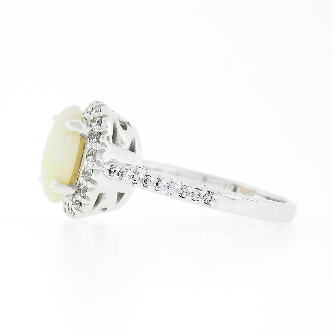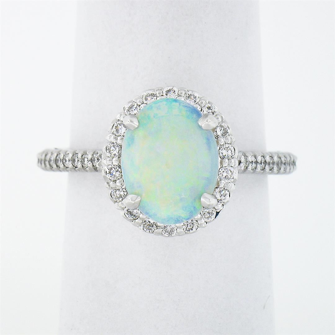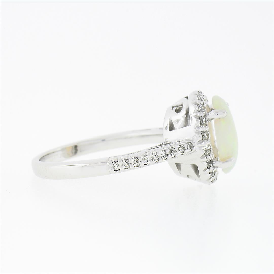 A new solid 14k white gold solitaire cluster ring, with 1 oval cabochon cut natural opal (10.3x8.0mm), surrounded with a halo of 36 round brilliant cut natural diamonds (F/G - VS1/VS2 ; 0.45ctw). The ring is size 7.0, weighs a total of 5.40 grams, and measures 14.45mm wide.