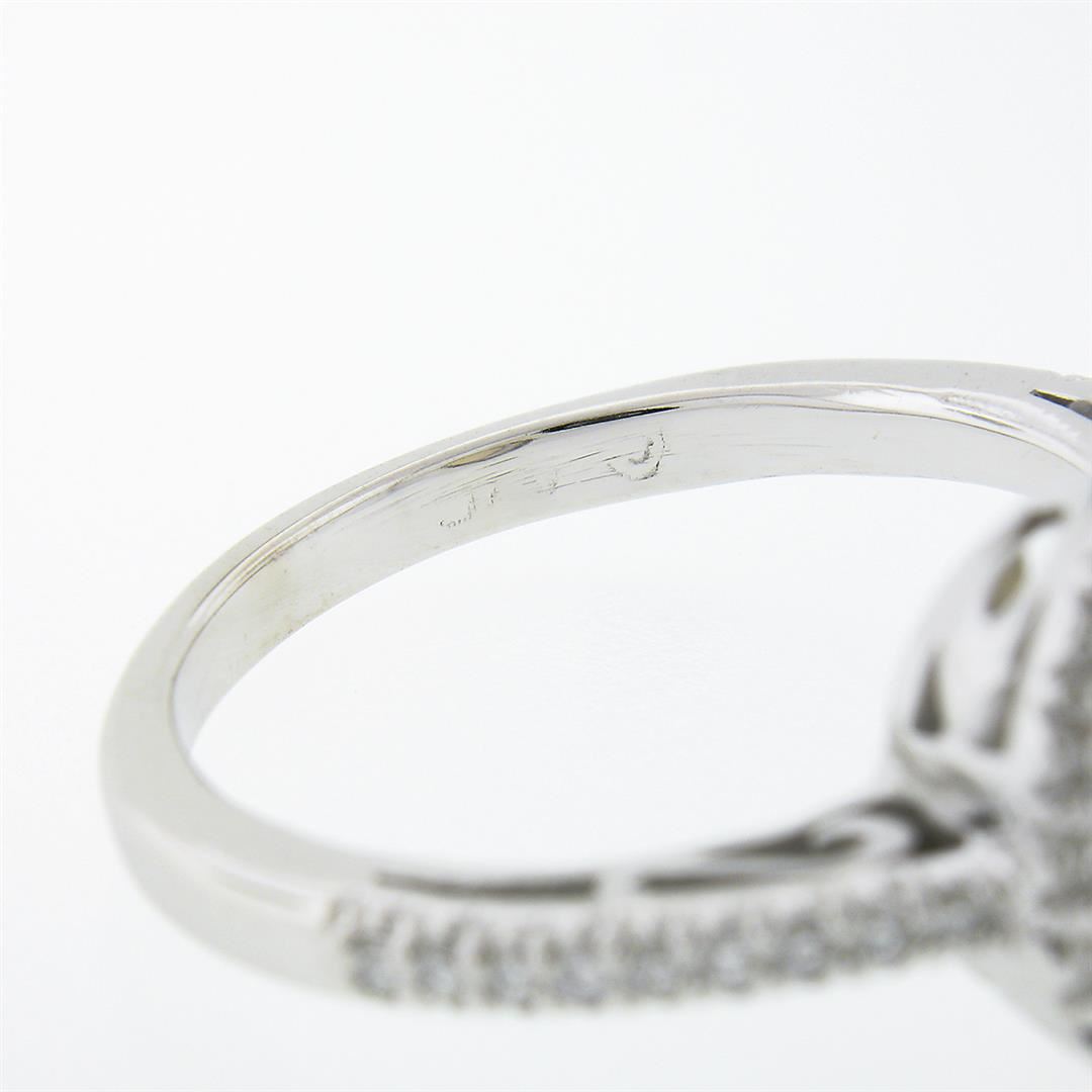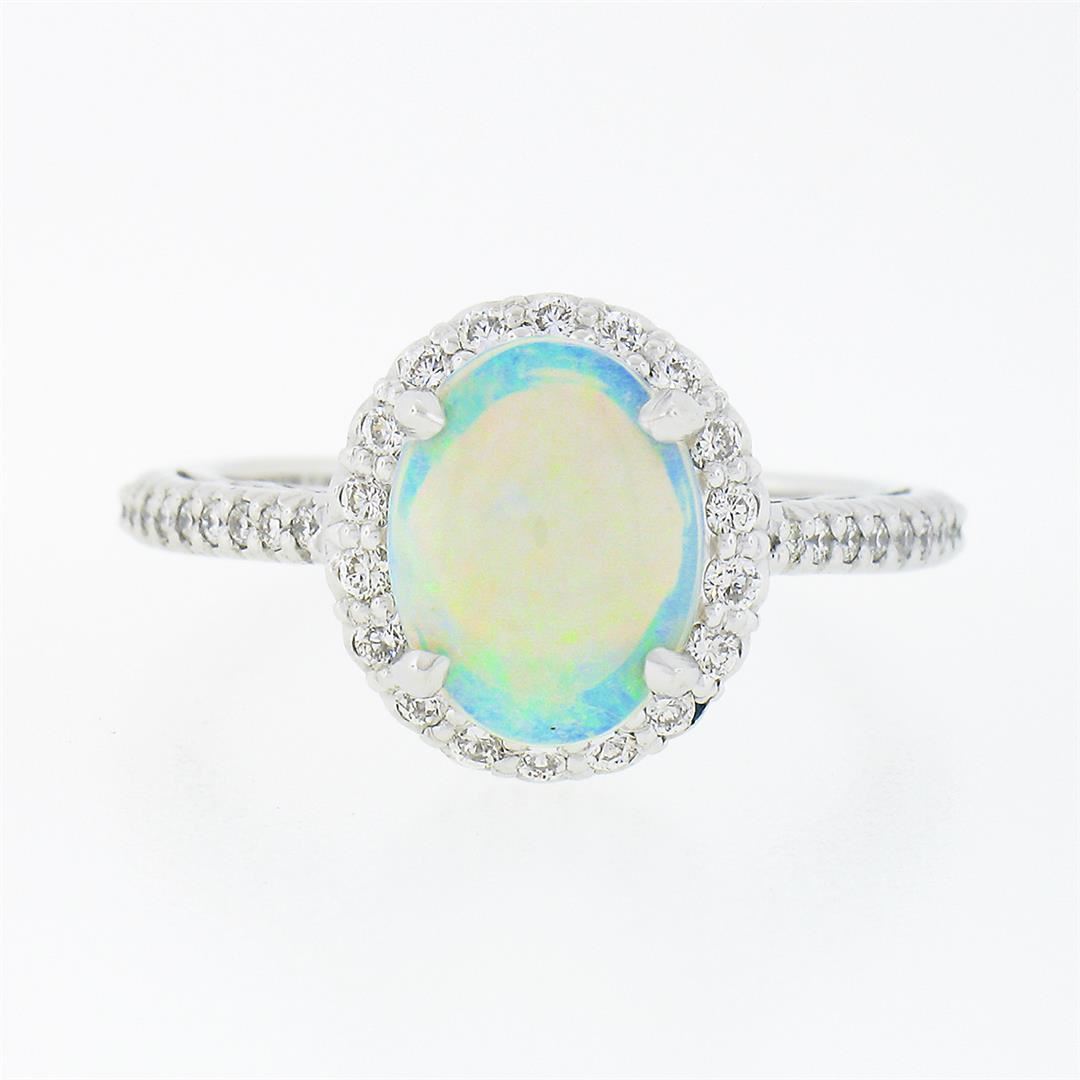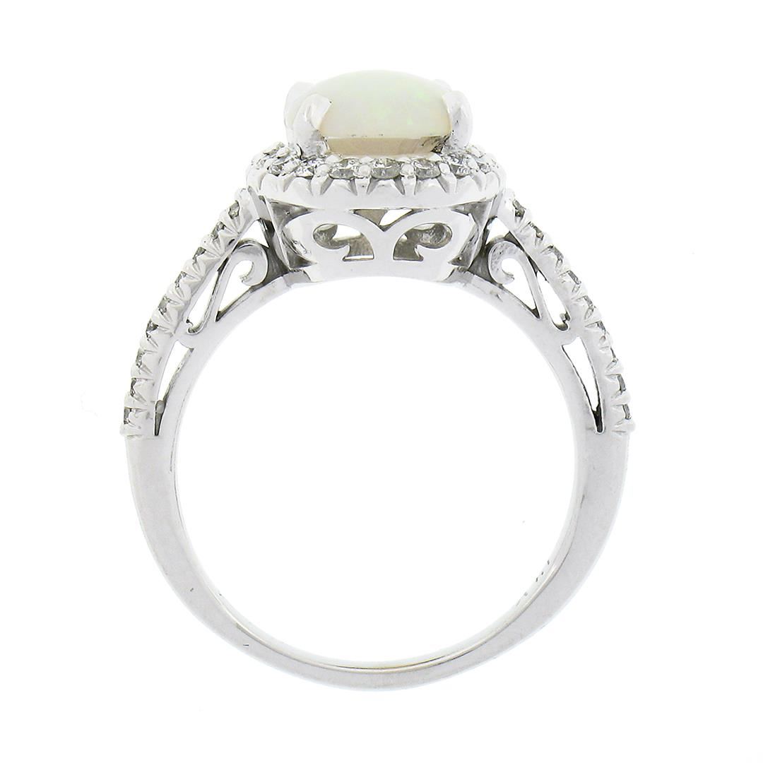 A new solid 14k white gold solitaire cluster ring, with 1 oval cabochon cut natural opal (10.3x8.0mm), surrounded with a halo of 36 round brilliant cut natural diamonds (F/G - VS1/VS2 ; 0.45ctw). The ring is size 7.0, weighs a total of 5.40 grams, and measures 14.45mm wide.